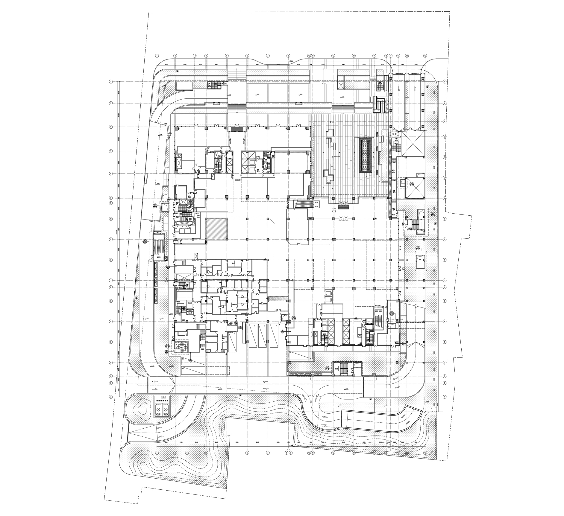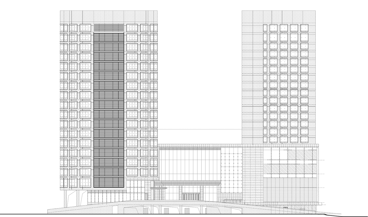 北側(cè)酒店塔樓面向泉城廣場(chǎng), 使得客房居住者在盡享泉城廣場(chǎng)的同時(shí), 亦可遠(yuǎn)眺大明湖。酒店諸如餐飲等重要功能,亦能享受泉城廣場(chǎng)景色及首層室外綠化廣場(chǎng)景色。南側(cè)位置較幽靜,在布局上設(shè)置為辦公區(qū)域,主立面亦面向泉城廣場(chǎng)。兩棟建筑與其他周?chē)ㄖ3诌m當(dāng)距離, 避免由于間距過(guò)近而造成的互望弊端。