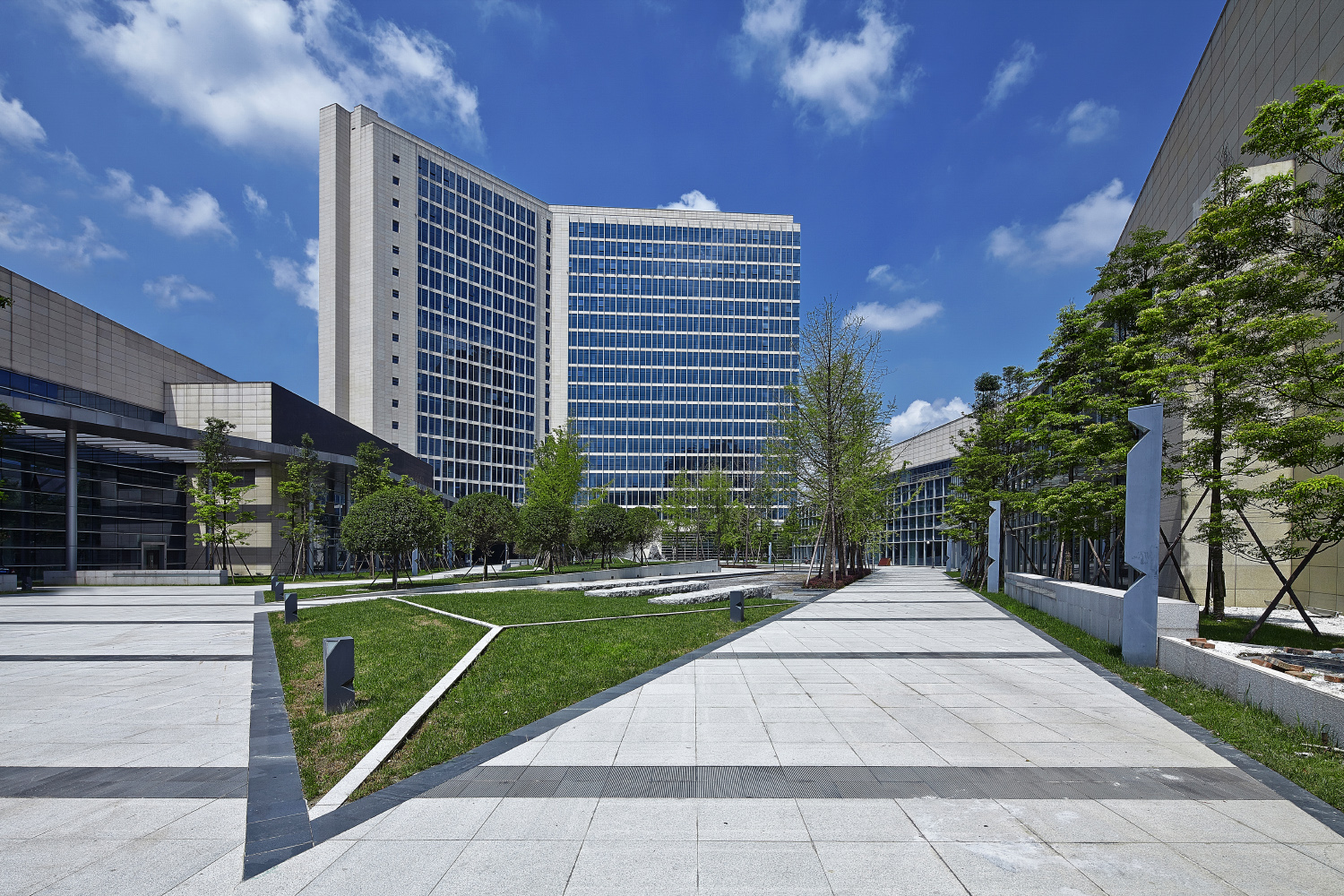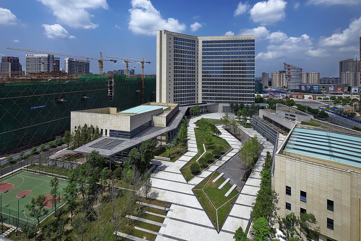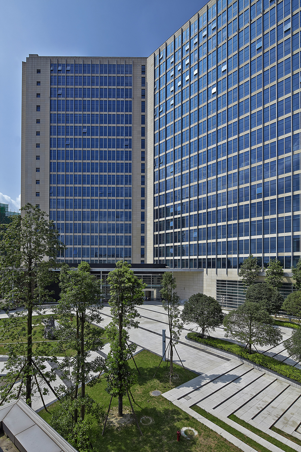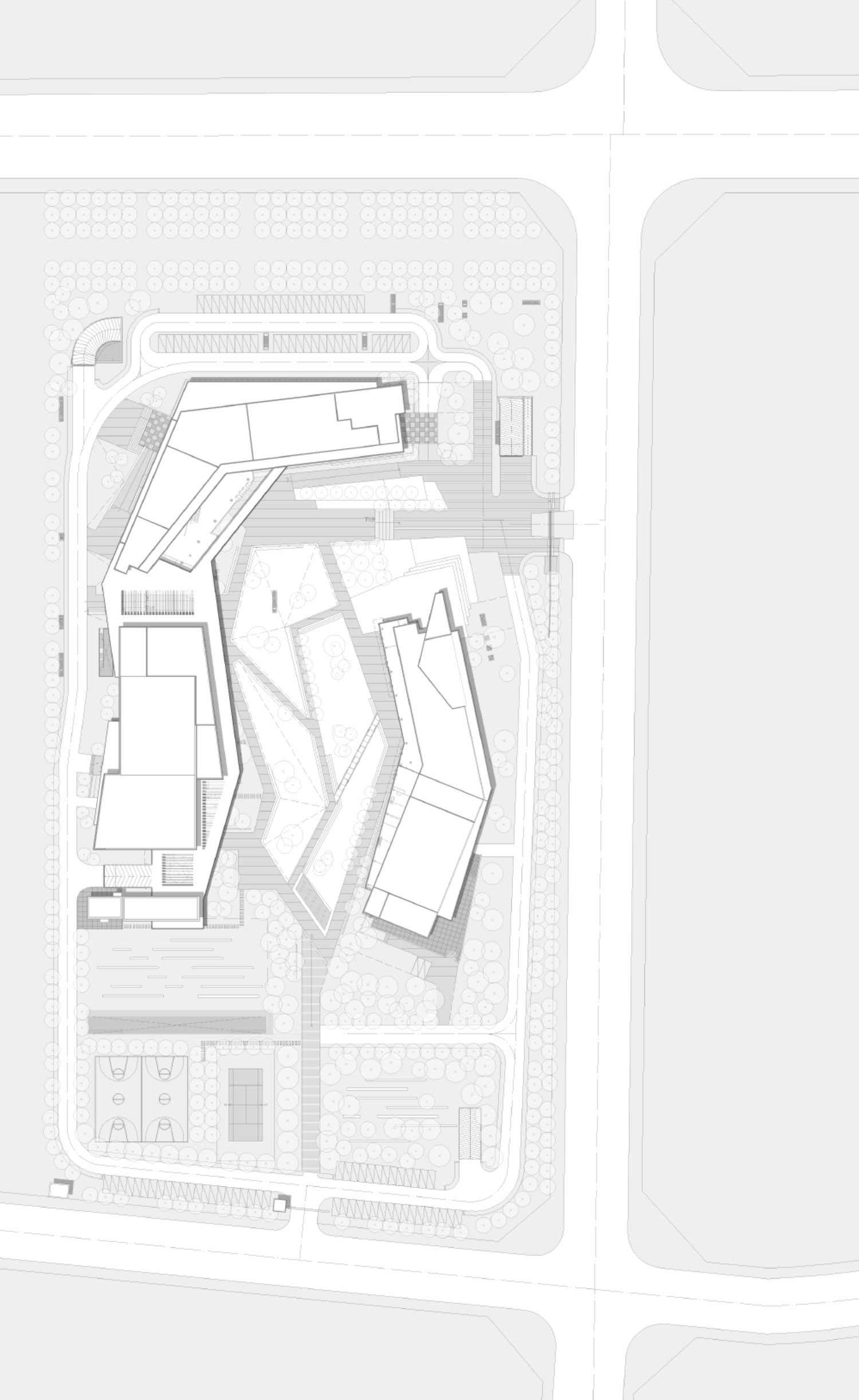 項目從開始就按高標準、高起點進行打造,并一直受到各界廣泛關(guān)注。項目是由辦公主樓、檔案館、職工餐廳、職工俱樂部四幢建筑單體組成的辦公群體建筑。建筑總平面采用折板圍合式布局,形成中央大尺度辦公庭院。整體規(guī)劃圍而不合,通過建筑平面的折線扭轉(zhuǎn),形成與城市脈絡(luò)之間和諧融入。建筑折線扭轉(zhuǎn)后在用地四個角部形成的外部環(huán)境能更好地形成空間尺度及視覺體驗上的緩沖,使建筑群體的形象更為延伸,謙遜地融入到城市環(huán)境之中。