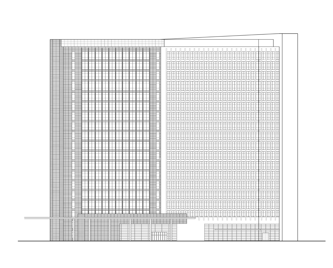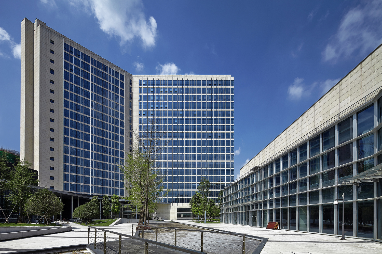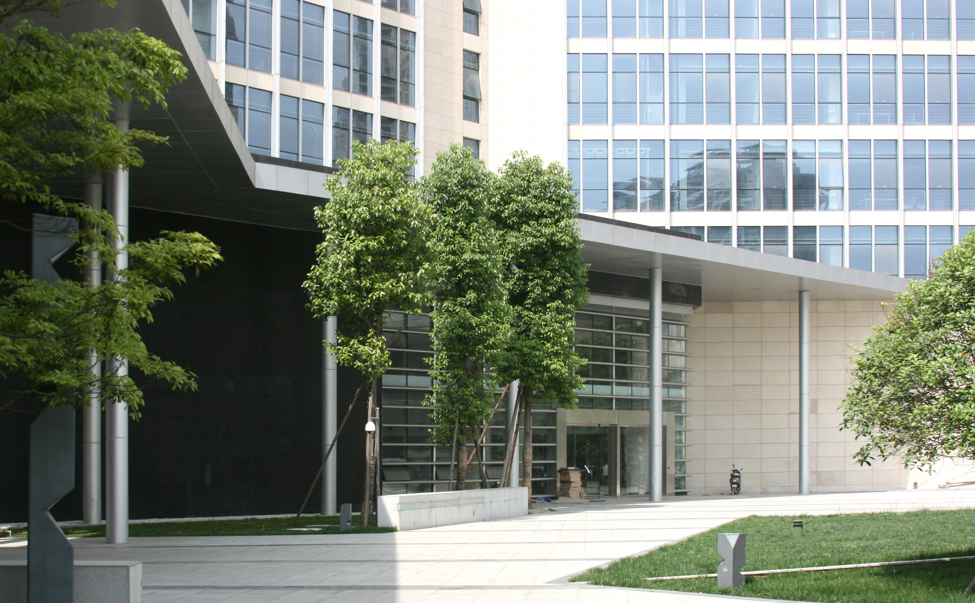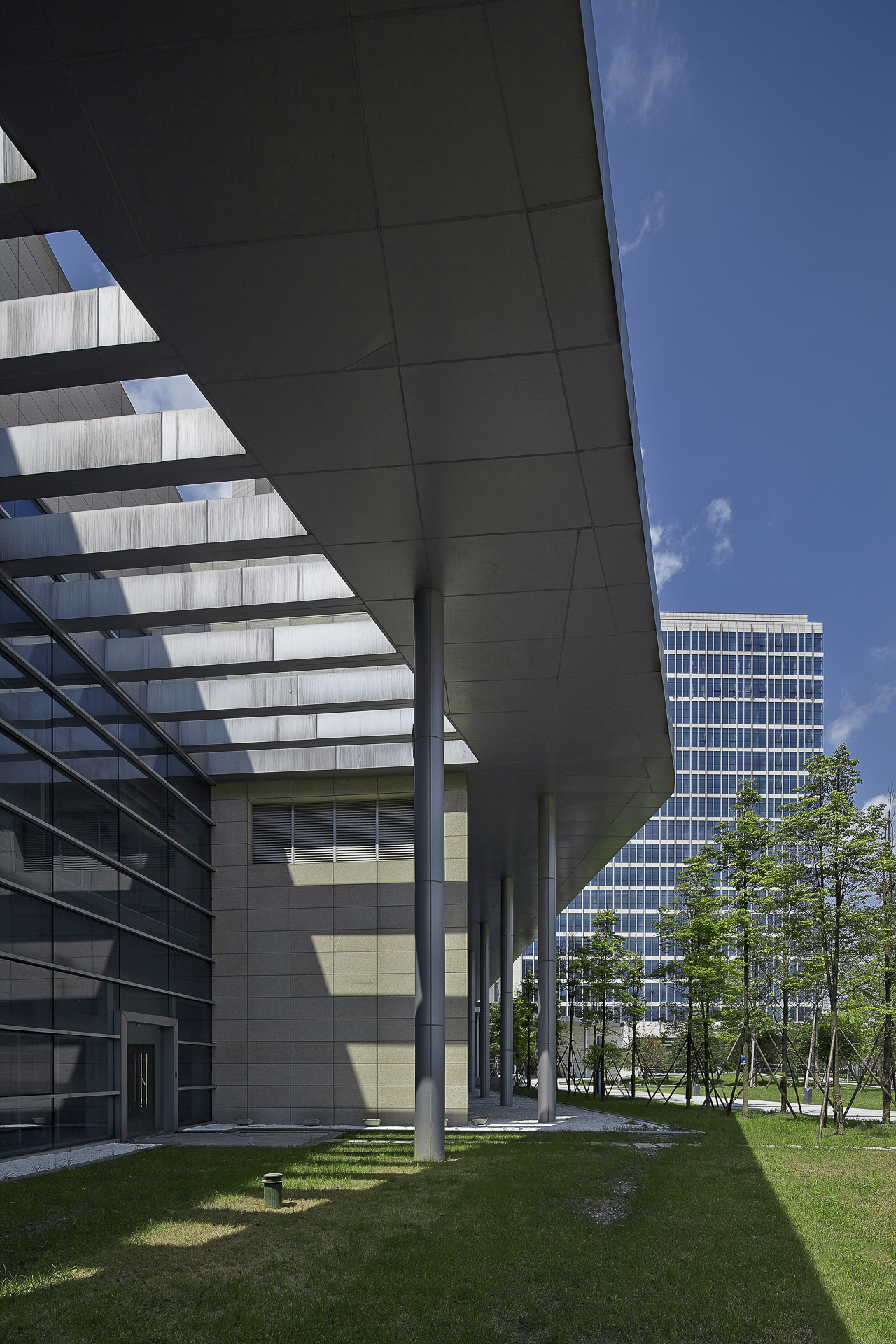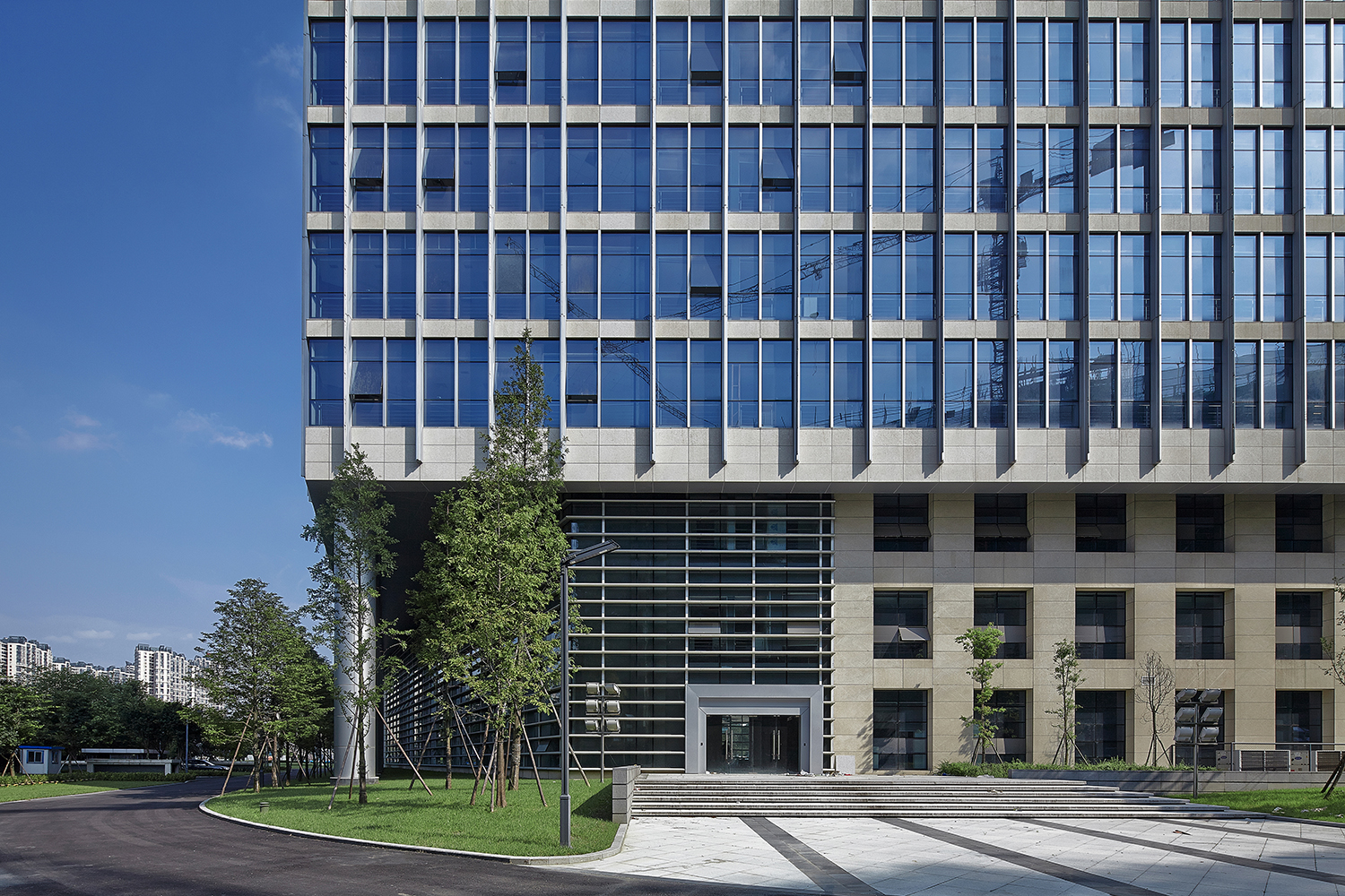 項目從開始就按高標準、高起點進行打造,并一直受到各界廣泛關(guān)注。項目是由辦公主樓、檔案館、職工餐廳、職工俱樂部四幢建筑單體組成的辦公群體建筑。建筑總平面采用折板圍合式布局,形成中央大尺度辦公庭院。整體規(guī)劃圍而不合,通過建筑平面的折線扭轉(zhuǎn),形成與城市脈絡(luò)之間和諧融入。建筑折線扭轉(zhuǎn)后在用地四個角部形成的外部環(huán)境能更好地形成空間尺度及視覺體驗上的緩沖,使建筑群體的形象更為延伸,謙遜地融入到城市環(huán)境之中。
