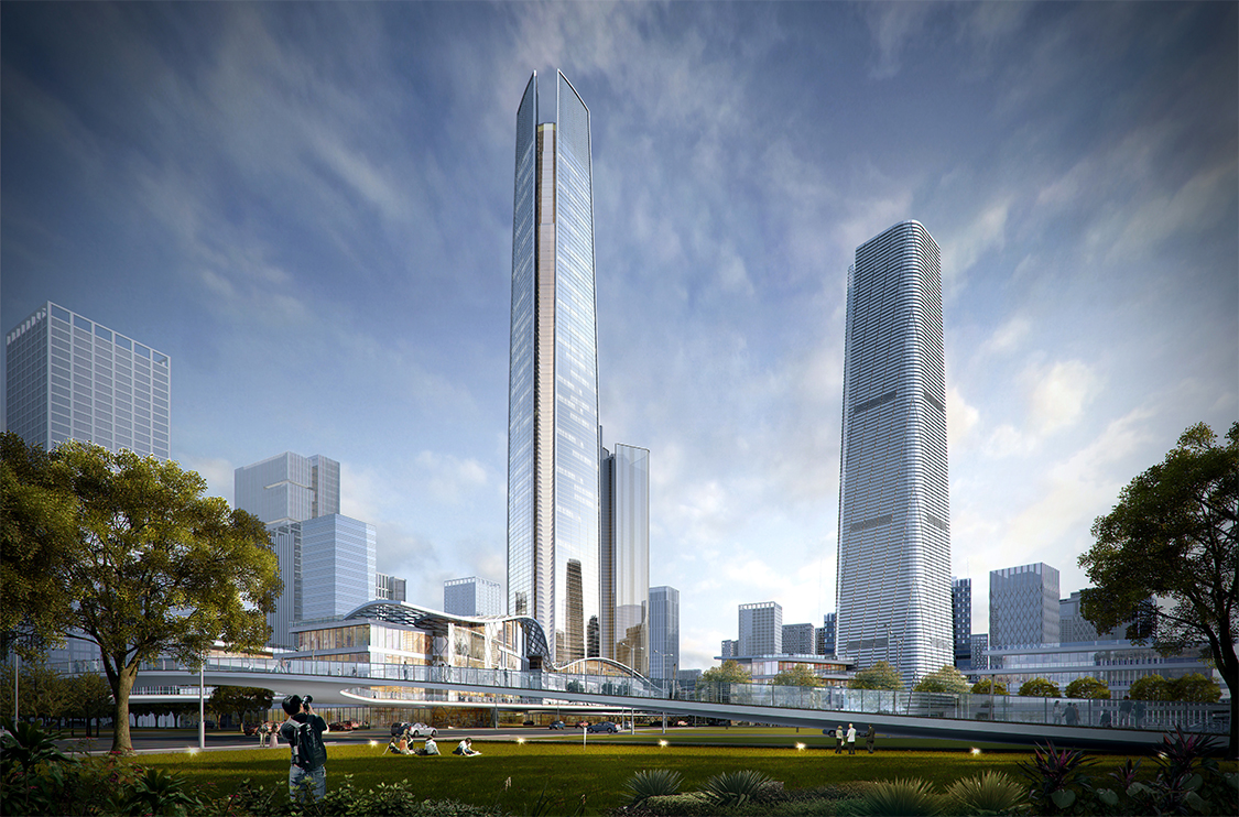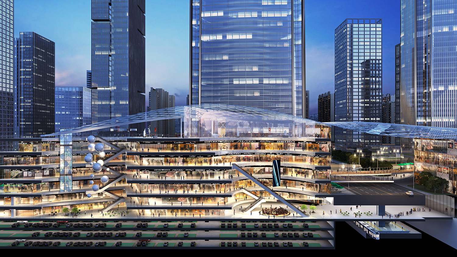 項(xiàng)目位于中央商務(wù)區(qū)核心地塊,著力打造以地鐵6號(hào)線及9號(hào)線交通優(yōu)勢(shì)為導(dǎo)向的中央商務(wù)區(qū),匯集了城市軌道交通、BRT、公交以及城市空中慢行系統(tǒng)等多種方式的立體交通體系。商業(yè)開發(fā)模式由原來(lái)的單一商業(yè)開發(fā)轉(zhuǎn)變?yōu)榧壍澜煌?、金融、商?wù)、辦公、居住、休閑娛樂(lè)為一體的TOD綜合開發(fā)模式。 項(xiàng)目區(qū)域內(nèi)軌道地下交通空間與各地塊相連,打破常規(guī)站廳層形象,行人可以從地鐵站廳層到達(dá)地下商業(yè),或者前往超高層辦公區(qū)域,也可通過(guò)飛天梯直達(dá)地上商業(yè)高區(qū)。地鐵站廳層設(shè)立藝術(shù)、生活及服務(wù)空間,與二層景觀廊橋結(jié)合,營(yíng)造出一個(gè)集娛樂(lè)、休閑、文化、出行為一體的城市會(huì)客廳。
