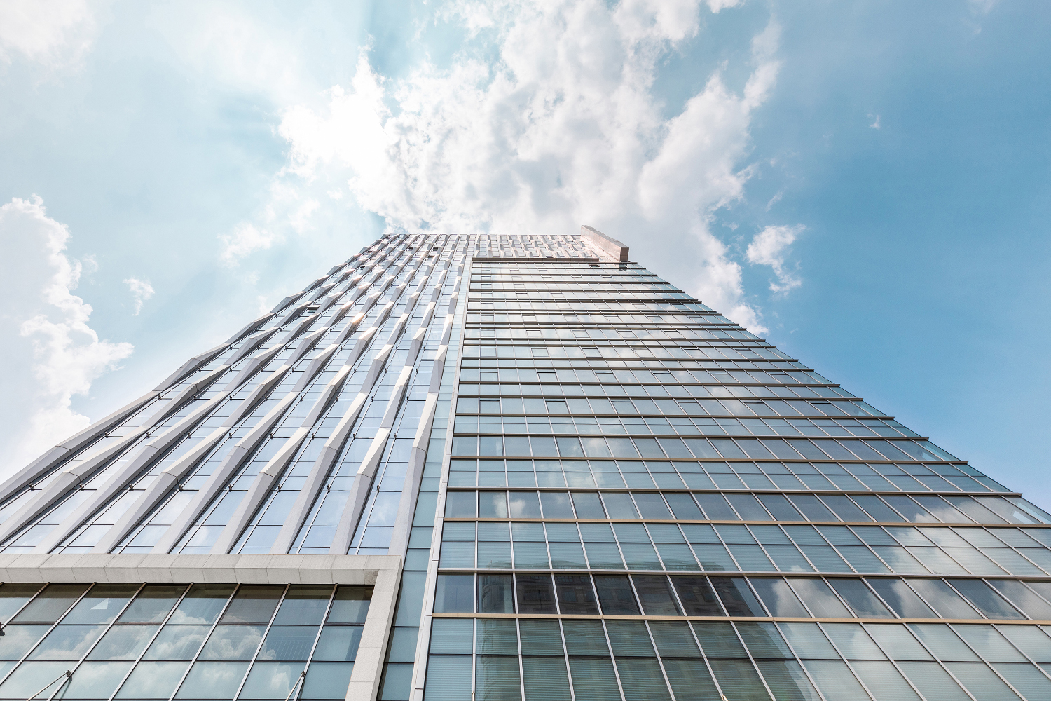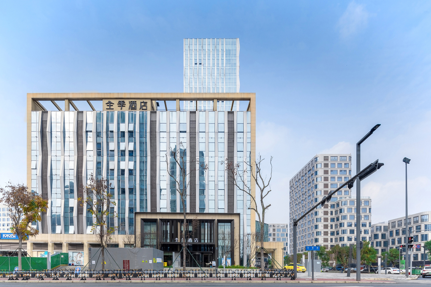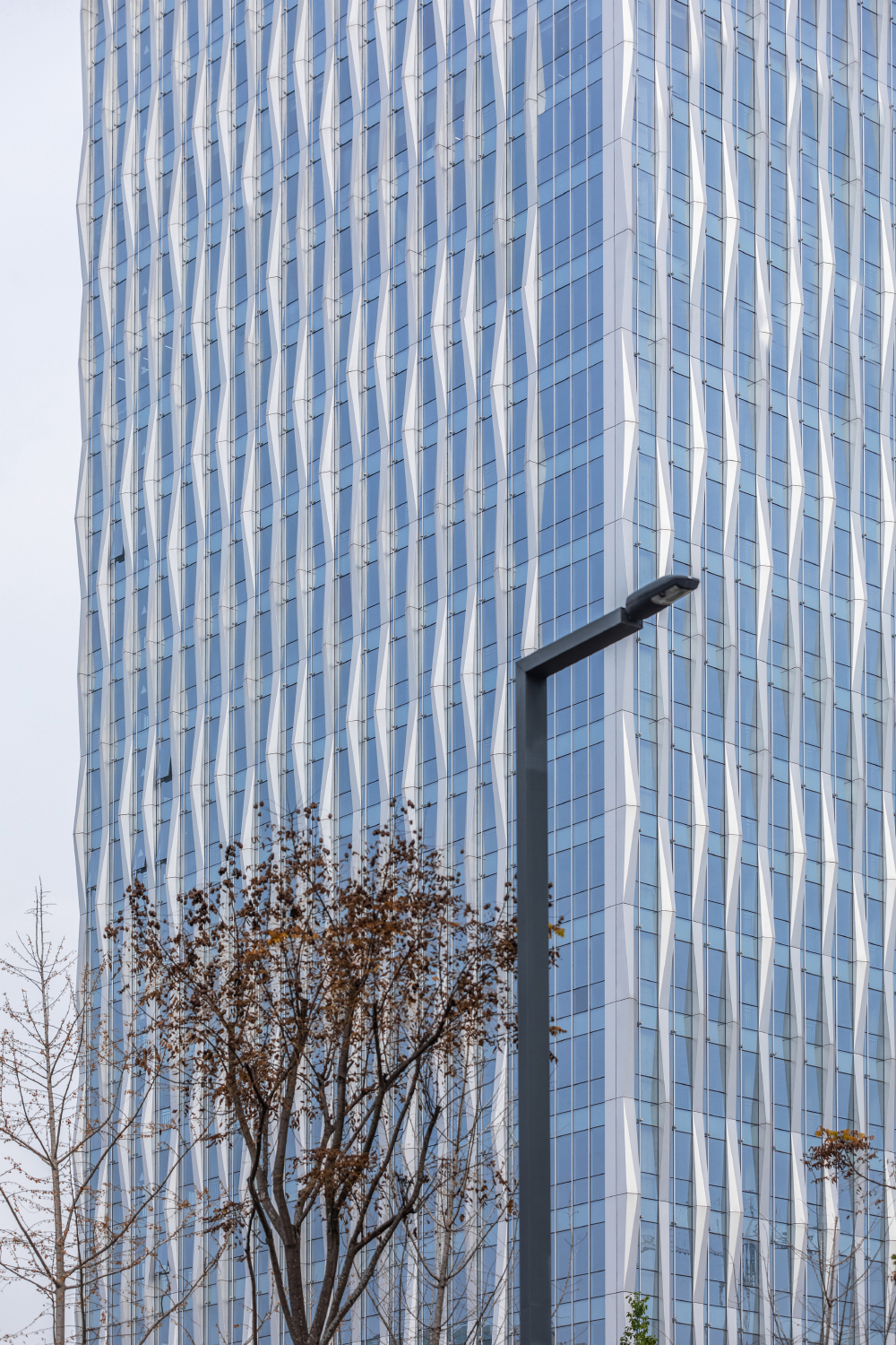 最高層辦公樓立面設(shè)計(jì)成抽象的水波紋路,將自然中的波浪律動(dòng)融入建筑,與興隆湖形成對話。外墻結(jié)合玻璃、金屬等元素,通過橫豎線條的不同處理,強(qiáng)化了建筑的形式感,使建筑更加的挺拔,充滿張力。精簡的折疊線條和開窗方式的微妙變化,使得建筑立面現(xiàn)代又不失活潑。