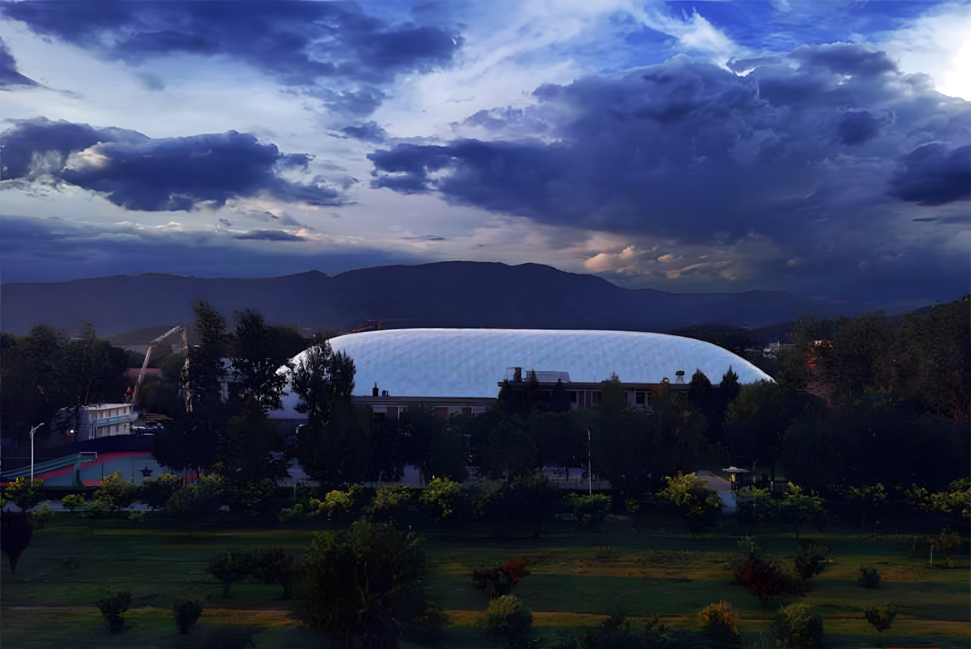 某綜合體能訓(xùn)練中心位于北京市香山公園南部,緊鄰西六環(huán),地處八大公園處,環(huán)境優(yōu)美,景色宜人。該館設(shè)計為一座多功能綜合性體育訓(xùn)練館,東西向長104 米,南北寬為50 米,占地面積為5200m2,總建筑面積為5800m2,建筑總高21 米,其中墻體高4 米,膜體高17 米。本項目采用了新型膜結(jié)構(gòu)技術(shù),具有綠色環(huán)保,能耗低,建筑施工周期短且易于拆遷。