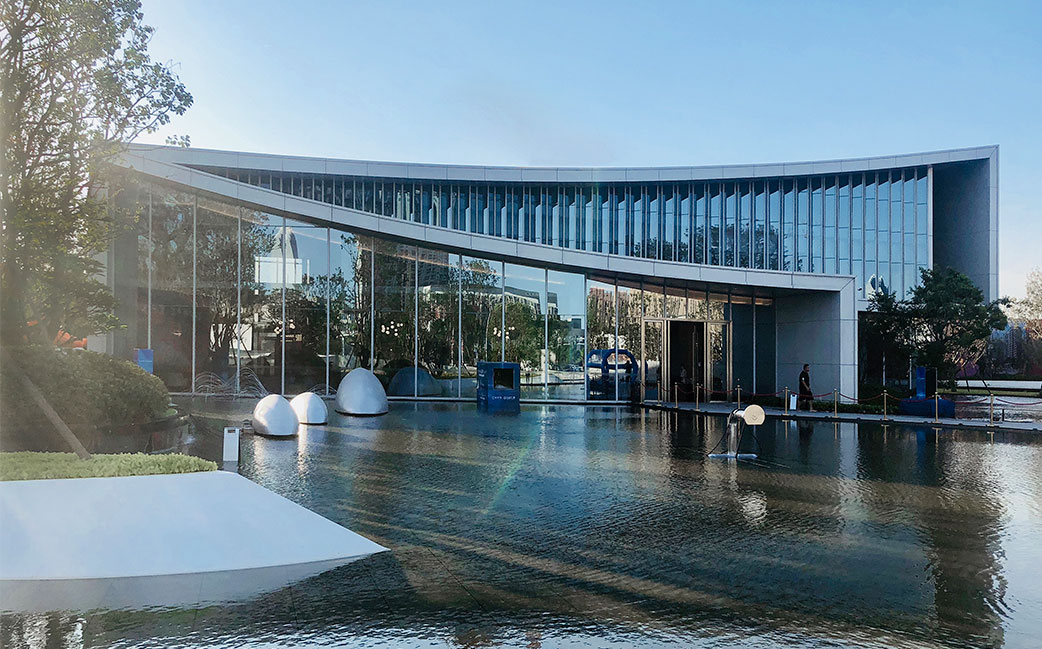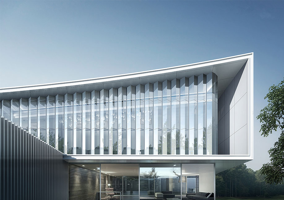 設(shè)計(jì)提煉莆田的印象與地域文化,將媽祖建筑屋頂概念置入設(shè)計(jì)之中。以現(xiàn)代挺拔的幾何線條,勾勒出靈動(dòng)的弧形屋面,形成高低錯(cuò)落的形體節(jié)奏。通過豎向玻璃幕墻的有序結(jié)拼疊,達(dá)到輕巧簡(jiǎn)潔、虛實(shí)有致的審美體驗(yàn)的同時(shí),也引入了莆田水景流動(dòng)的韻律感。大面積的玻璃幕墻通透如玉,與水中倒映虛實(shí)交錯(cuò)互為對(duì)景,再由天光云影充當(dāng)背景,營(yíng)造出“清風(fēng)徐來,水波不興”的生態(tài)美感和恬淡心境。