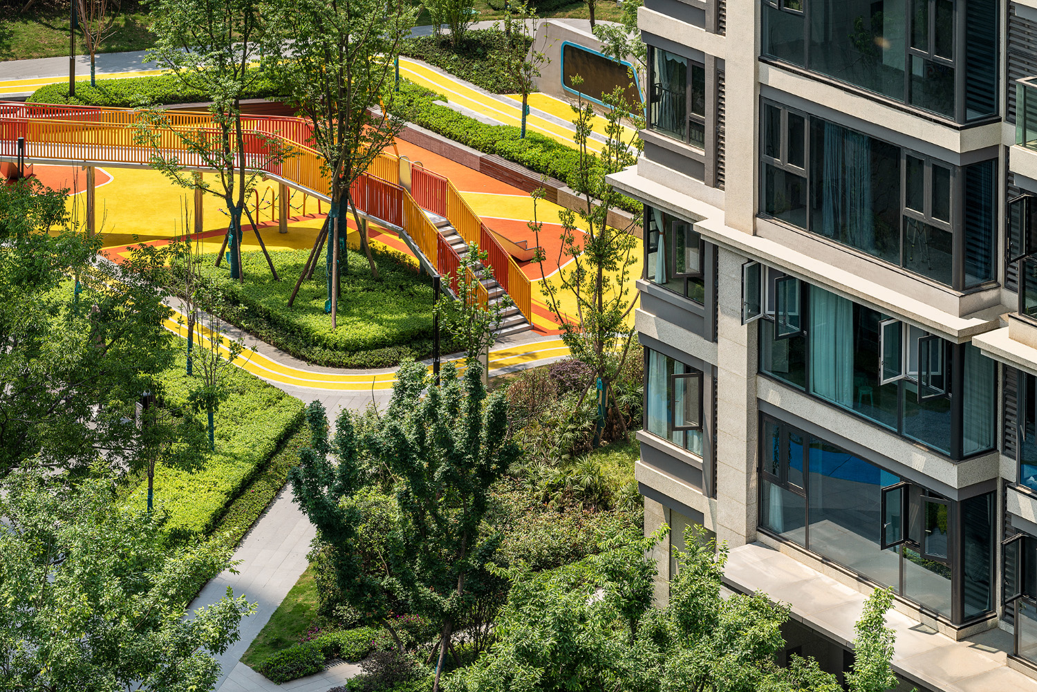 格柵、光影、留白為社區(qū)平添了迷人的靜謐之感。項(xiàng)目不僅充分考慮與城市外部空間環(huán)境的融合,也非常注重內(nèi)部建筑形態(tài)尺度的變化與雕琢。