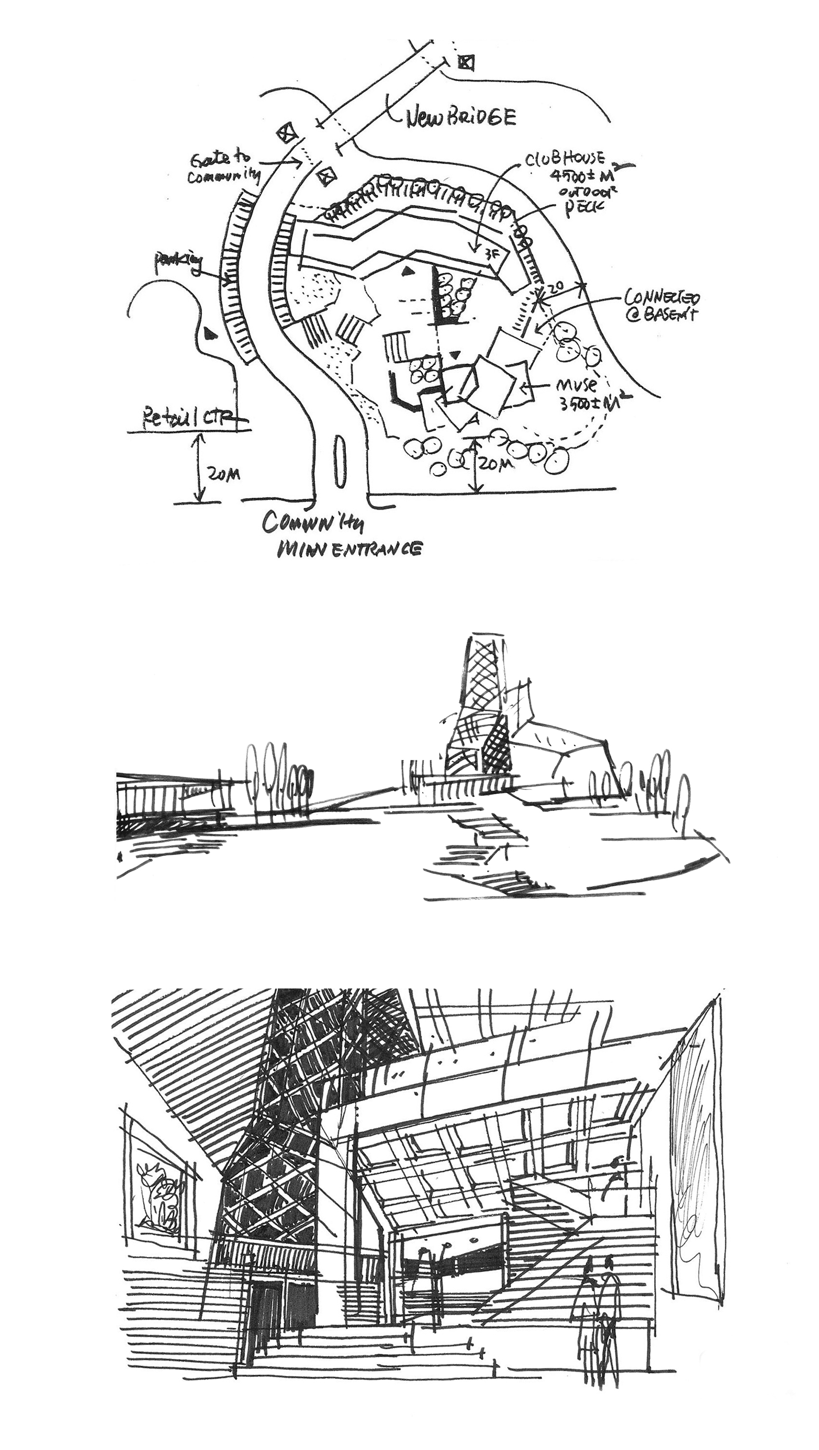 本地塊位于貴陽市長嶺南路以西,小灣河東側,周邊為規(guī)劃建設中心住宅區(qū)。項目布局上充分利用并尊重地形條件,結合起伏的場地現(xiàn)狀,處理建筑與城市道路、景觀人流之間的和諧平衡,給藝術館所要求的靜沁安逸的環(huán)境品質創(chuàng)造了條件,并結合藝術本身特質,在設計中采用了較大膽的構成主義思想,由內而外地自由伸展、自由起伏穿插的形態(tài)、自由而富有激情的建筑三維空間,使其本身不僅是展示藝術創(chuàng)造的場所,更是一件藝術品。設計努力營造新穎、活潑的現(xiàn)代藝術館,其靈感源于自然狀態(tài)中一堆碎石的聯(lián)想,并將之打造成為長嶺南路一側新時代的地標性建筑。
