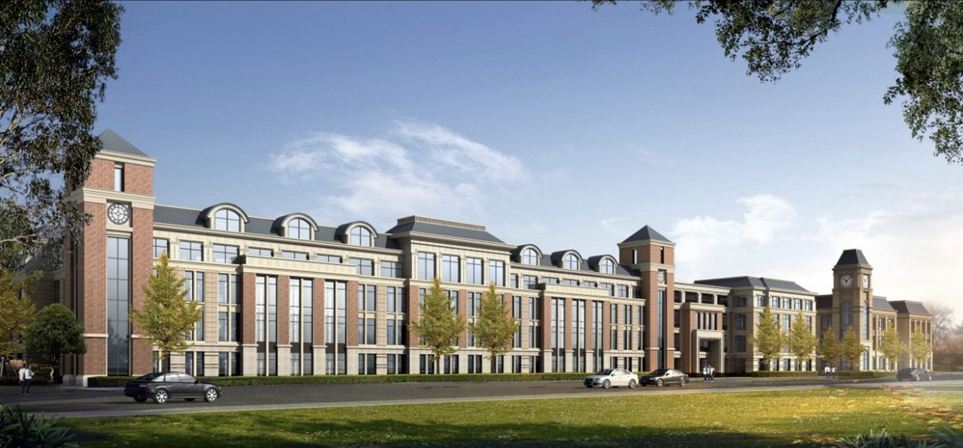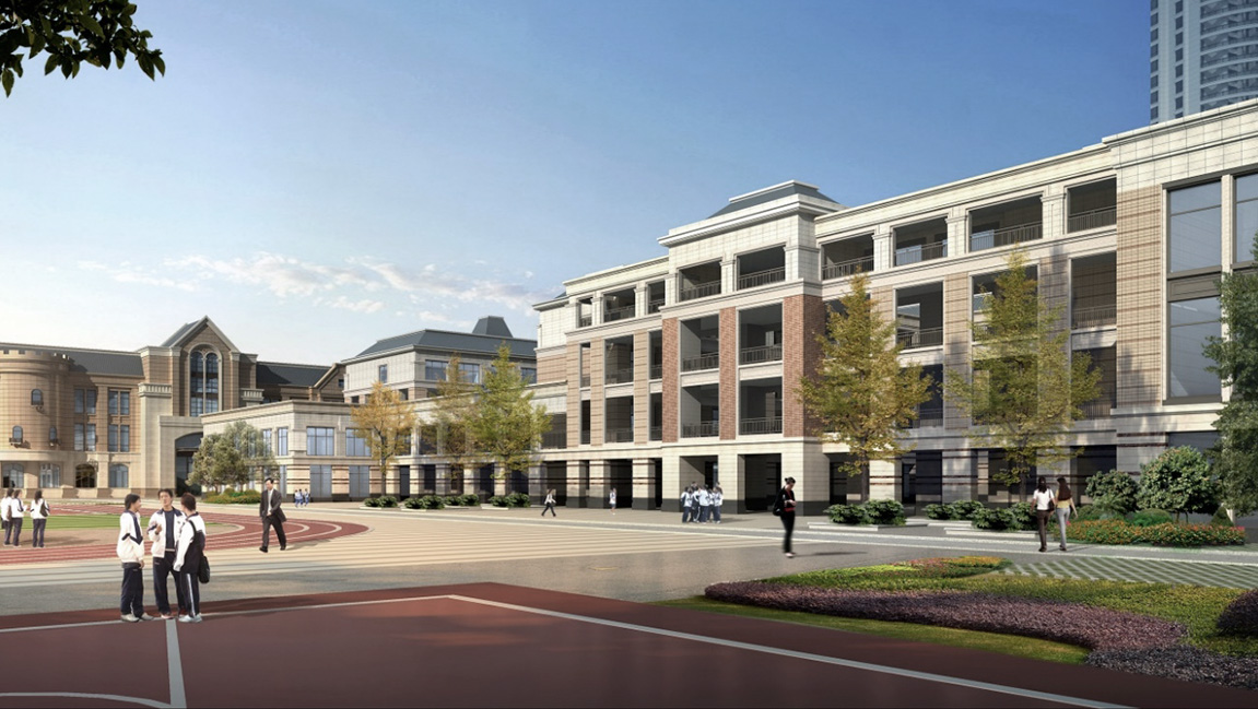 鏈接,形成圍合式布局,不僅土地利用率高而且易營造學(xué)院氣氛。結(jié)合規(guī)劃路網(wǎng),將其劃分為小學(xué)區(qū)、幼兒園區(qū)、派出所居委會區(qū)。立面設(shè)計采用歐式風(fēng)格,應(yīng)用紅磚材質(zhì),體現(xiàn)大氣、莊重的貴族學(xué)校氣息。并結(jié)合周邊山體景觀注重建筑與環(huán)境的融合,營造優(yōu)美的景觀環(huán)境。