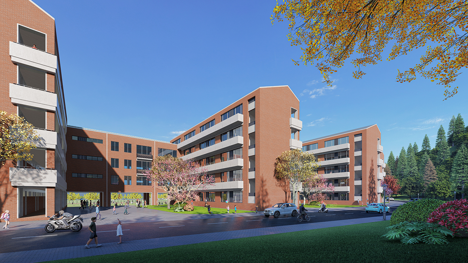 項(xiàng)目設(shè)計(jì)充分結(jié)合地域地形特點(diǎn),建筑以運(yùn)動(dòng)場(chǎng)地為中心呈半圍合式規(guī)劃布局,發(fā)射線(xiàn)式的空間布局形成井然有序的學(xué)??臻g序列。項(xiàng)目主要包含6棟多層建筑和一層地下車(chē)庫(kù),包括教學(xué)樓、圖書(shū)綜合館、行政辦公樓、學(xué)生宿舍、教師管理用房、風(fēng)雨操場(chǎng)等,均沿用地外側(cè)呈行列式布局,動(dòng)靜有序,界面舒朗。項(xiàng)目面對(duì)城市主界面設(shè)置運(yùn)動(dòng)場(chǎng)地形成開(kāi)闊空間,同時(shí)在城市主要道路主要轉(zhuǎn)角處設(shè)置對(duì)景建筑,與城市有機(jī)融合,和諧共生。首層利用局部架空為園區(qū)釋放出更多活動(dòng)空間,促進(jìn)師生活動(dòng)交流,同時(shí)也打開(kāi)了園區(qū)東西向視野,營(yíng)造出視野通透、豐富立體的空間品質(zhì)。,統(tǒng)一簡(jiǎn)潔的橫向欄桿線(xiàn)條讓校園具有韻律感,磚紅色及米白色相間形成建筑的虛實(shí)對(duì)比和體塊關(guān)系,展現(xiàn)了一個(gè)優(yōu)雅的校園風(fēng)情園區(qū)。