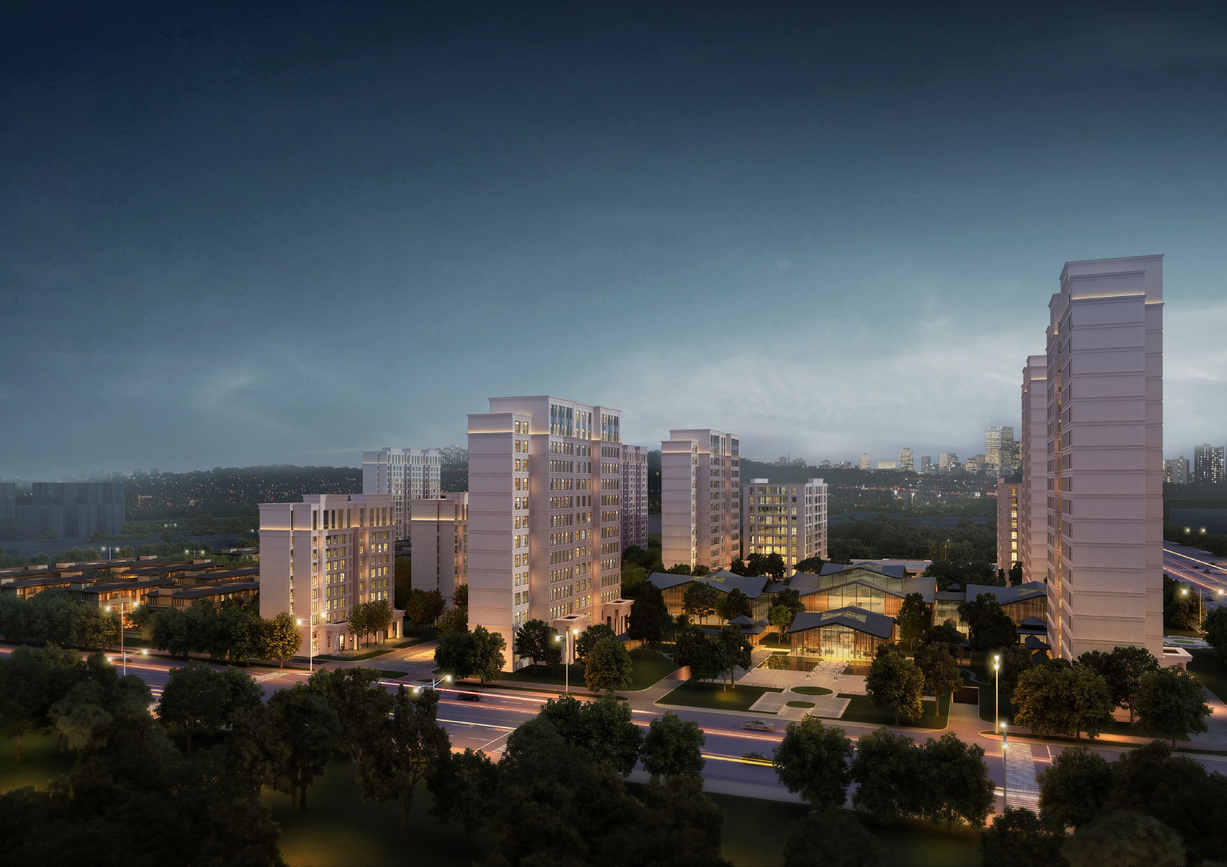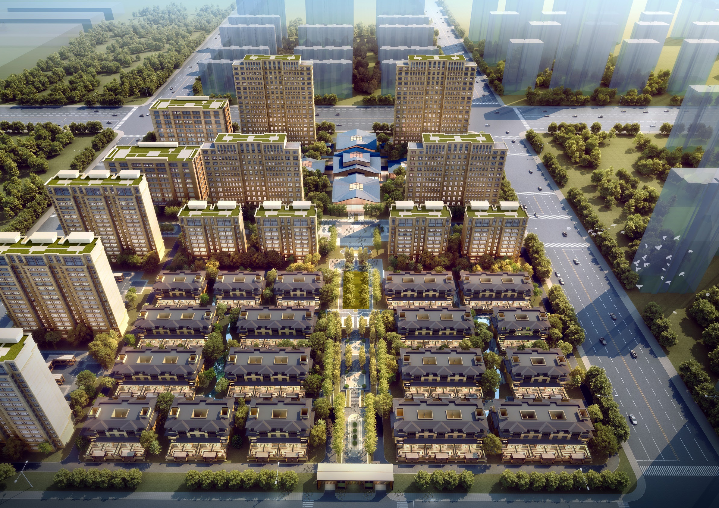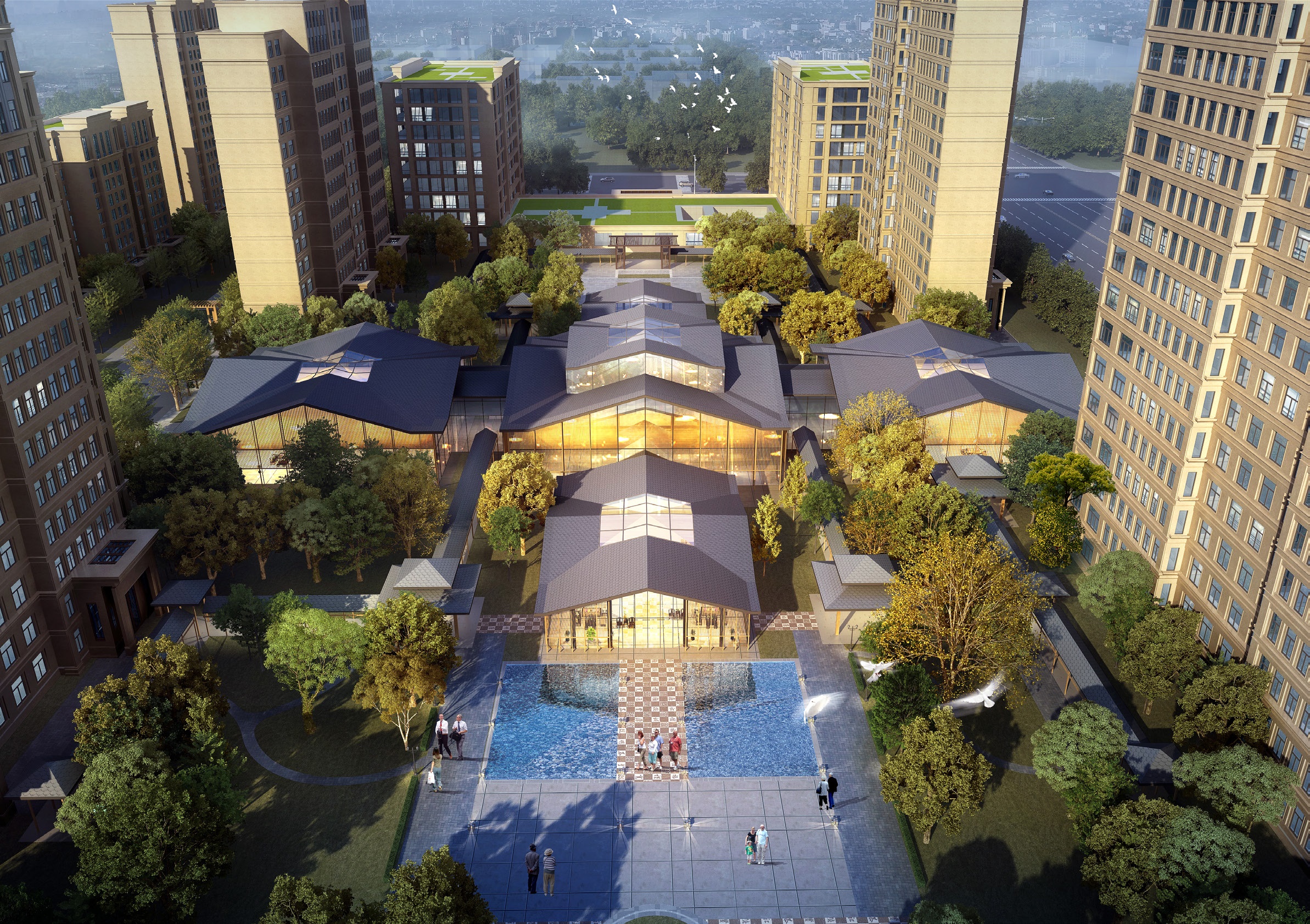 項(xiàng)目整體規(guī)劃上利用東西軸線,串聯(lián)各空間組團(tuán)?!皷|方景觀軸”基于東方園林藝術(shù),通過庭院層次、空間收方、山光潭影、堆山疊石等元素,結(jié)合觀者思想內(nèi)涵,修身養(yǎng)性。“西方禮儀軸”重視不同景觀組合,盡顯大氣與奢華,給予行人良好的步行體驗(yàn)。整體上即融合了東方傳統(tǒng)建筑之美,也糅合了西方建筑的精致。