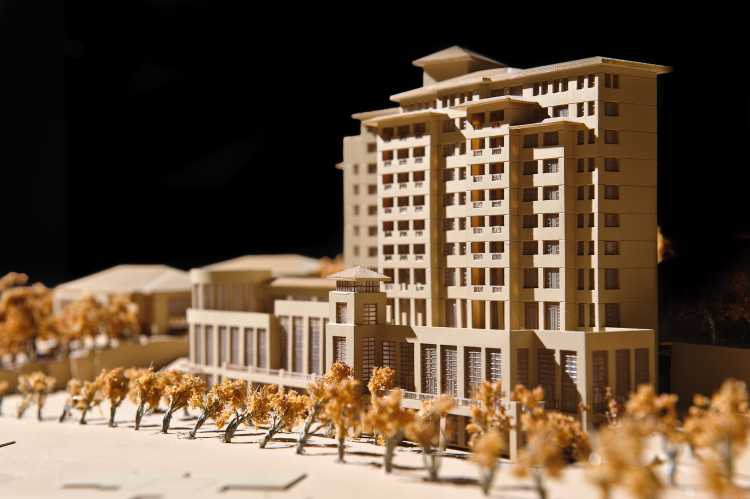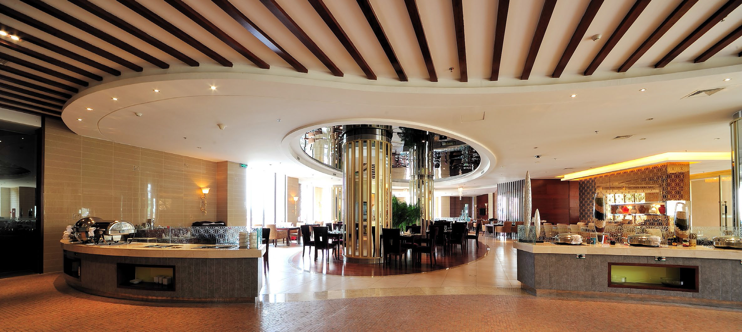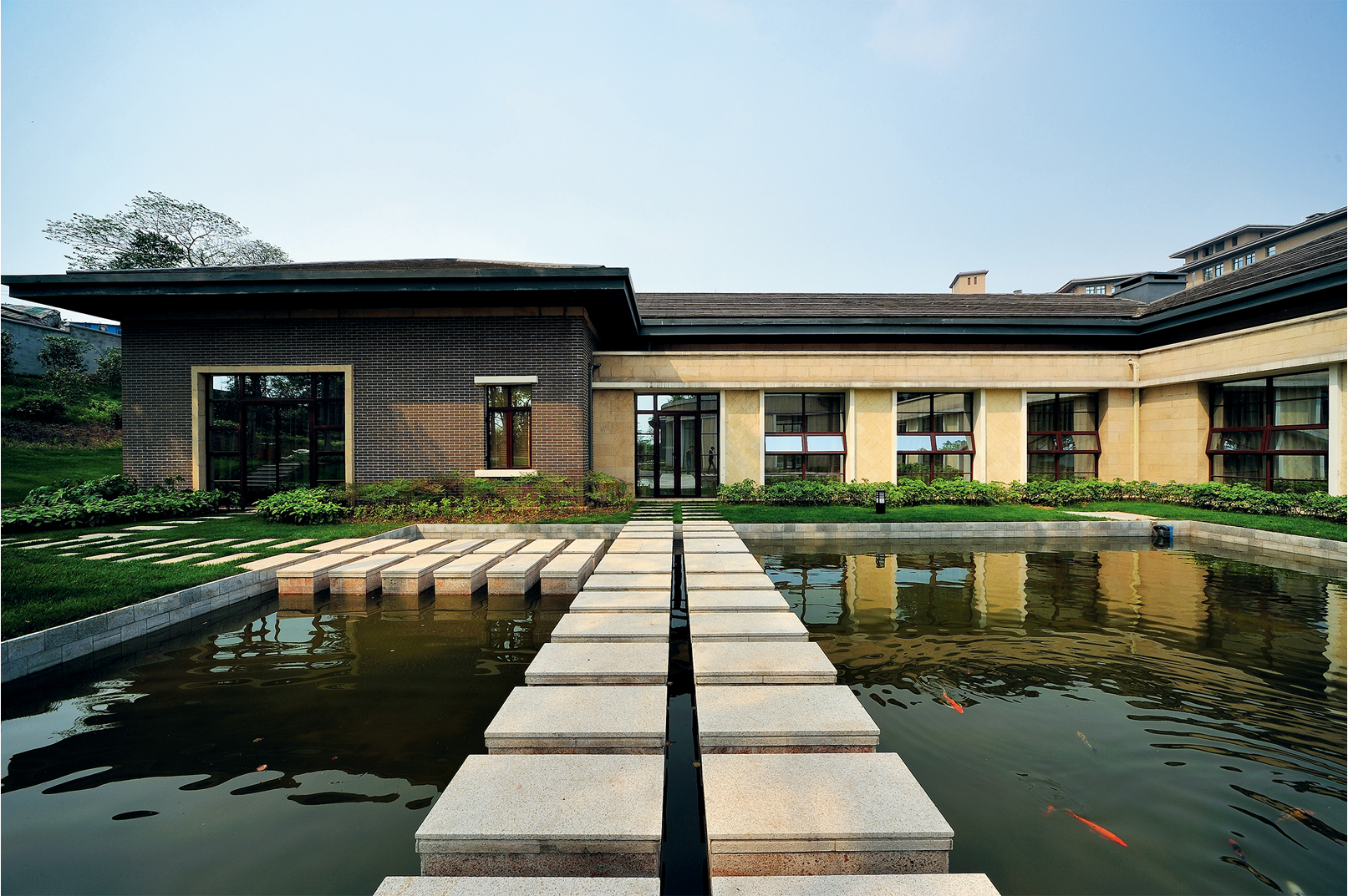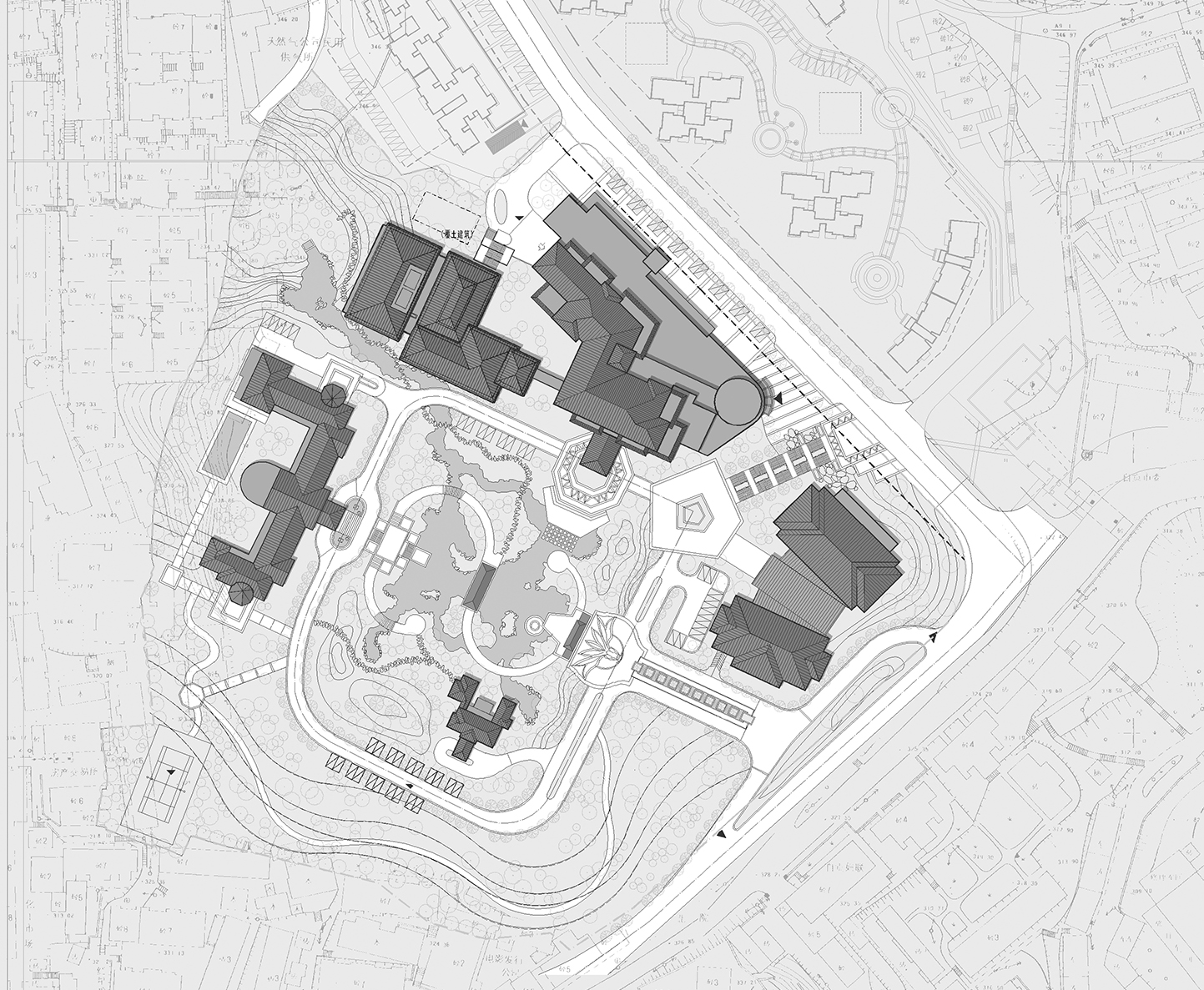 本案設計中采用圍合式規(guī)劃布局,將酒店內(nèi)部的庭院空間最大化釋放,整體建筑風格以“新古典主義”配以地區(qū)特色的裝飾元素,體現(xiàn)穩(wěn)重高貴的氣質(zhì),景觀的主要概念源于自貢市的三大特色之一的燈籠,互相連接、包含的景觀元素,正是沿用了大小不一的燈籠連接一體的形態(tài)特征,置身其中,每向前邁一步,都有不同的景色出現(xiàn)在眼前,所有設計元素組合在一起最終形成與自然統(tǒng)一和諧的園林式五星級酒店。