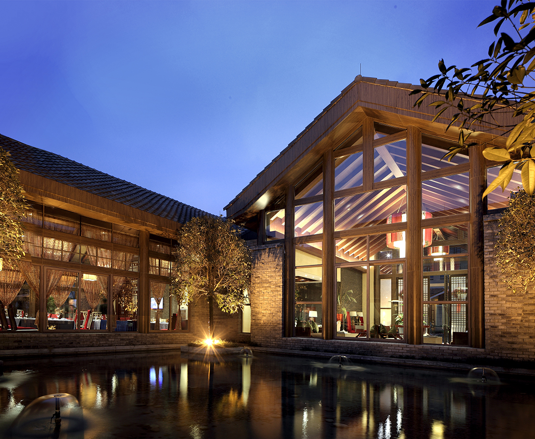 建筑布局和形態(tài)塑造借鑒四川當(dāng)?shù)亟ㄖ木?,充分體現(xiàn)新津的文脈特征和風(fēng)土人情為當(dāng)?shù)刎Q立高標(biāo)準(zhǔn)的豪華酒店建筑標(biāo)桿,成為當(dāng)?shù)刂匾某鞘信涮坠?jié)點(diǎn)。