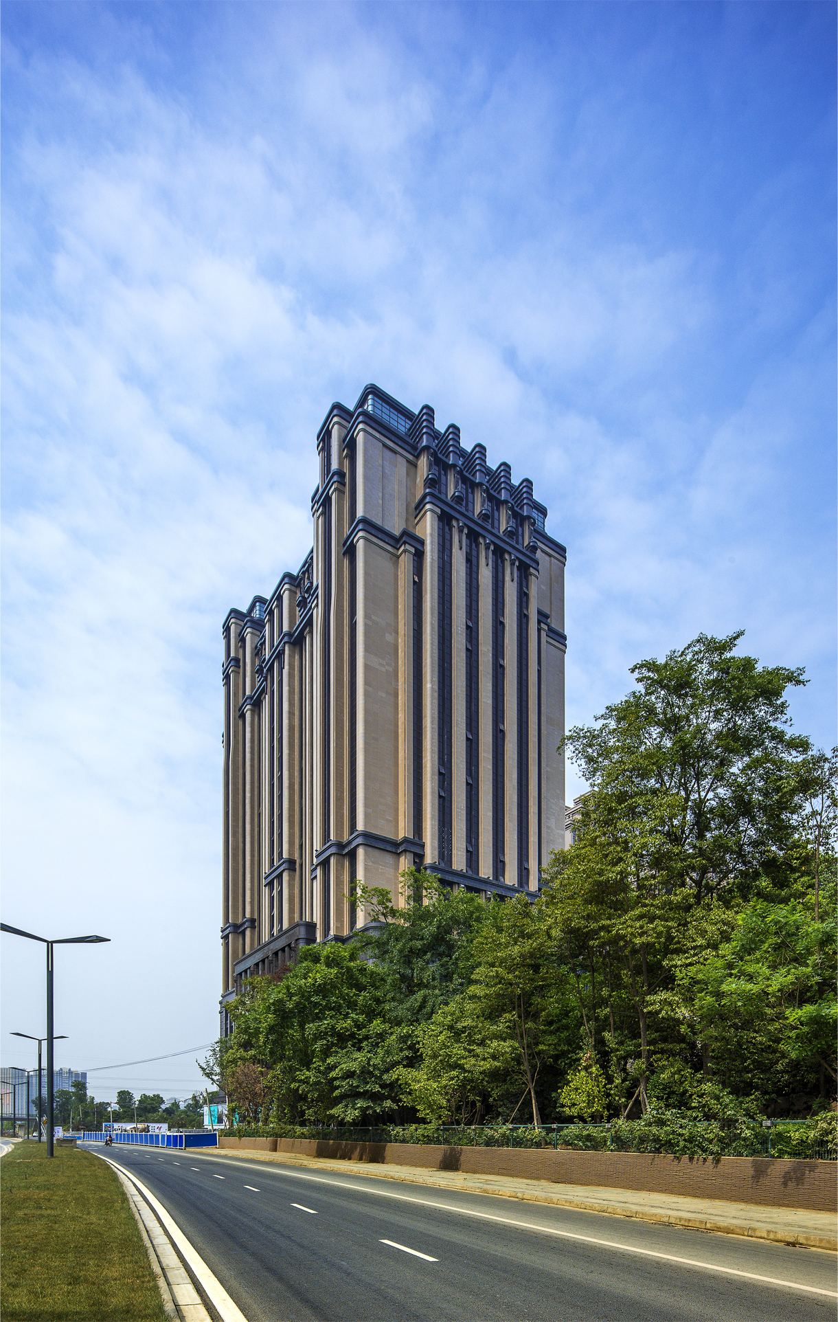 項目是集會議、餐飲,休閑娛樂為一體的多功能五星級酒店。提供面積不小于50平方米的客房300多間。酒店采用幾何的形體,對稱的構(gòu)圖、階梯的造型體現(xiàn)出古典、大氣的氣質(zhì)。立面上以剛?cè)岵?jì)的橫豎線條、流暢的圓弧形,呈現(xiàn)出一種高貴的質(zhì)感與光澤。酒店高130m,注冊為五星級。建筑整體外觀全部采用進(jìn)口石材打造,塑造高端奢華形象。酒店設(shè)計用于舉辦會議、派對和其他類型的活動,300 間客房均位于其裝飾藝術(shù)風(fēng)格的立面后面,以優(yōu)雅的垂直石線作為裝飾點綴。