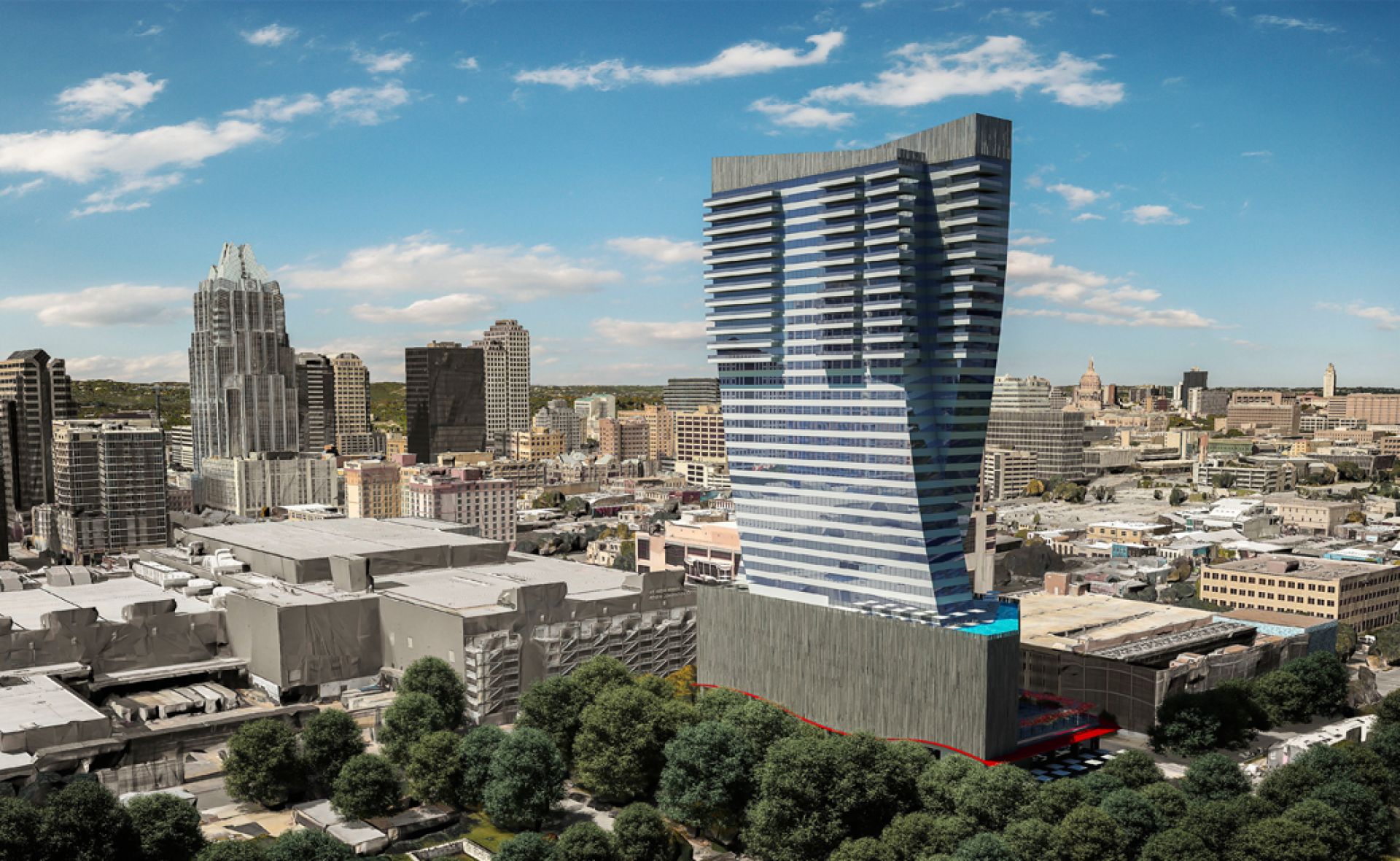 奧斯汀會議酒店是一座標志性的36層高層大廈,設有一家五星級300間客房的會議酒店和100套品牌公寓,配備了屋頂露臺、游泳池、會議設施和停車平臺。