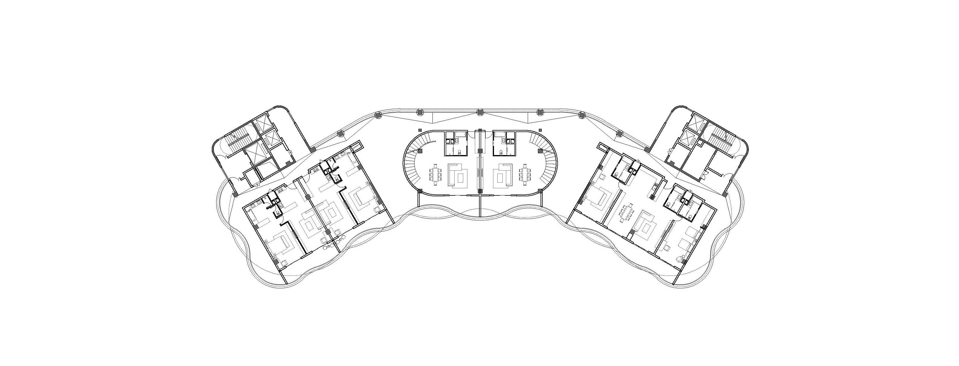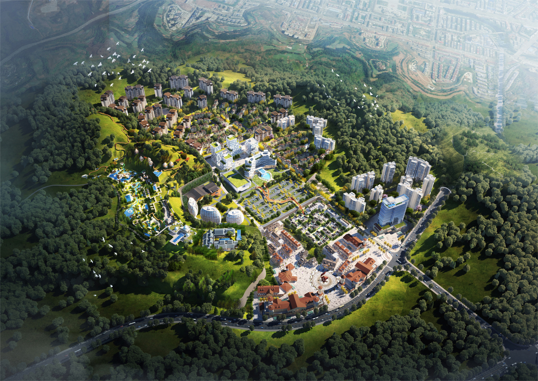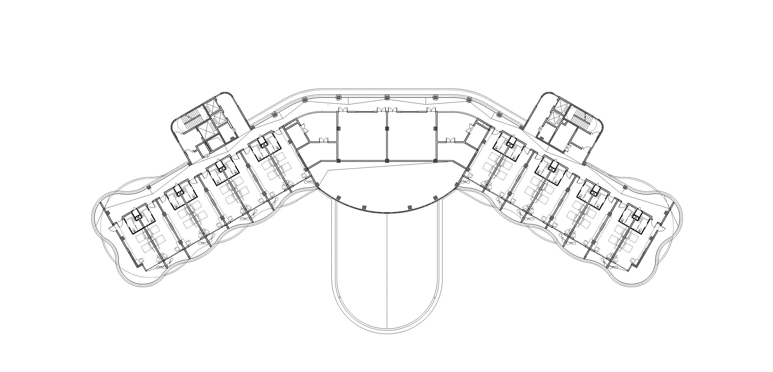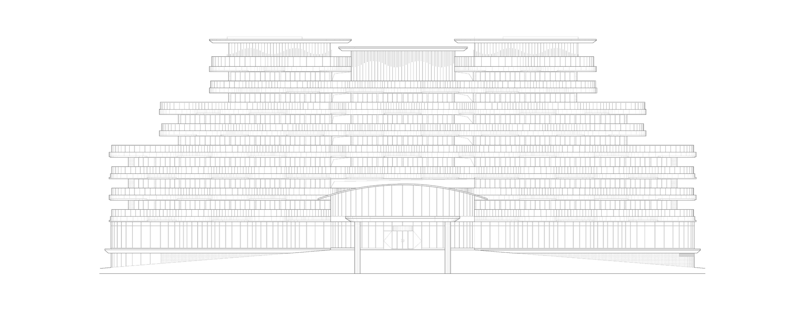 項(xiàng)目采取“一環(huán)雙核,一廊兩軸,多節(jié)點(diǎn),五大功能片區(qū)”的規(guī)劃形式。其中,南區(qū)以道路及山體為界,規(guī)劃形成五大功能片區(qū):絲路?琳瑯里、絲路?一千零一夜、絲路?云端溫泉海、絲路?甘泉谷和絲路?駝鈴灣。酒店位于“絲路?一千零一夜”片區(qū),結(jié)合絲路60國文旅論壇永久會址(國際會議中心)、溫泉服務(wù)中心(中國鹽鹵溫泉博覽館)、溫泉親子度假公寓、藝術(shù)之家(演出用品商場、演員公寓、商務(wù)酒店)等,打造成為奇域小鎮(zhèn)內(nèi)部的酒店會議集群。建筑以“絲綢之路”為主題進(jìn)行創(chuàng)作,既體現(xiàn)地域特色,又與歷史文化交融積淀,構(gòu)成過去與現(xiàn)代的共生,衍生出豐富多彩的建筑風(fēng)貌。同時(shí),建筑采用獨(dú)特的地貌紋理,提煉出作為建筑表皮元素與圖案的鮮明文化符號。