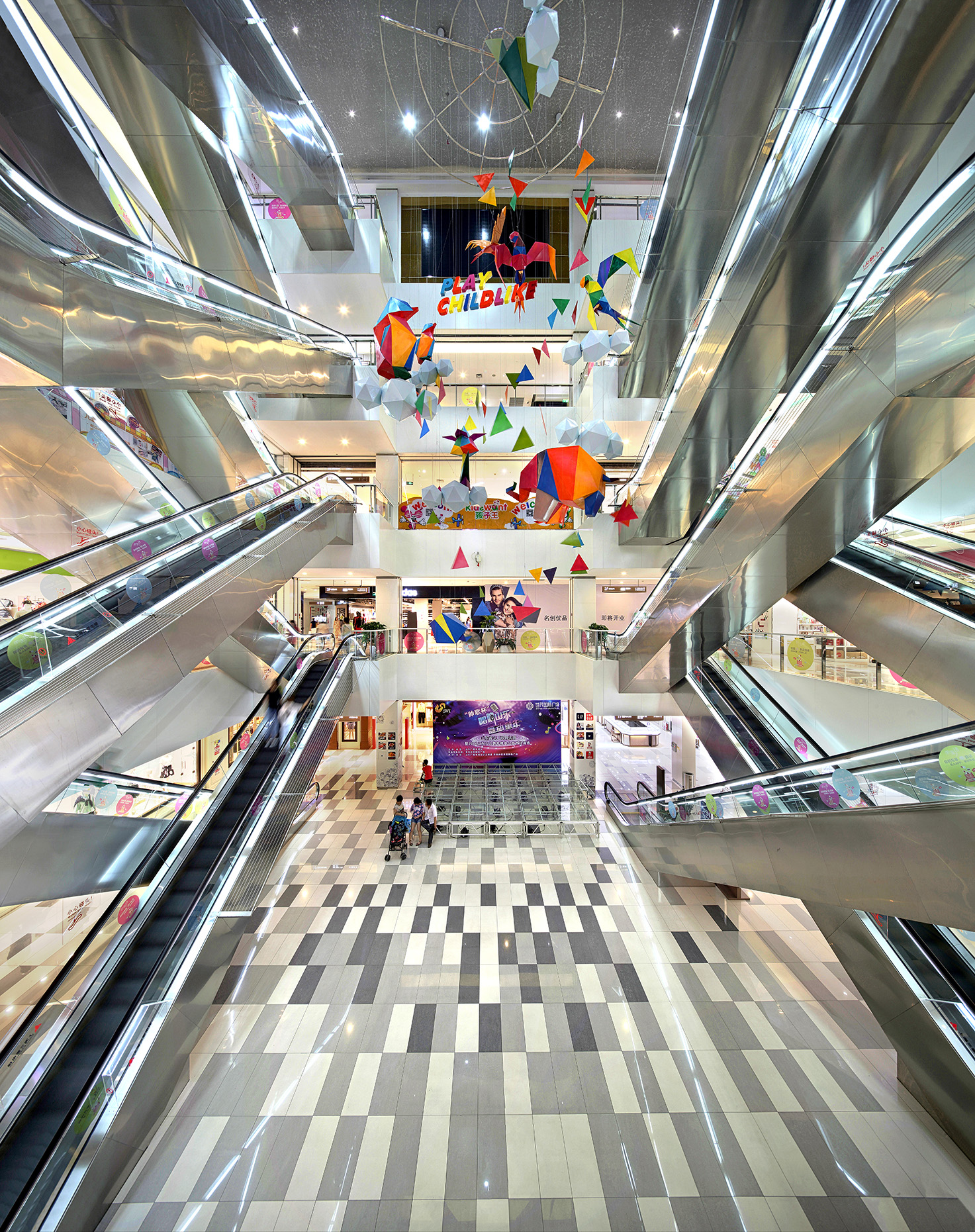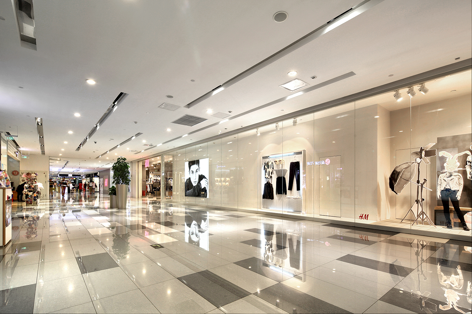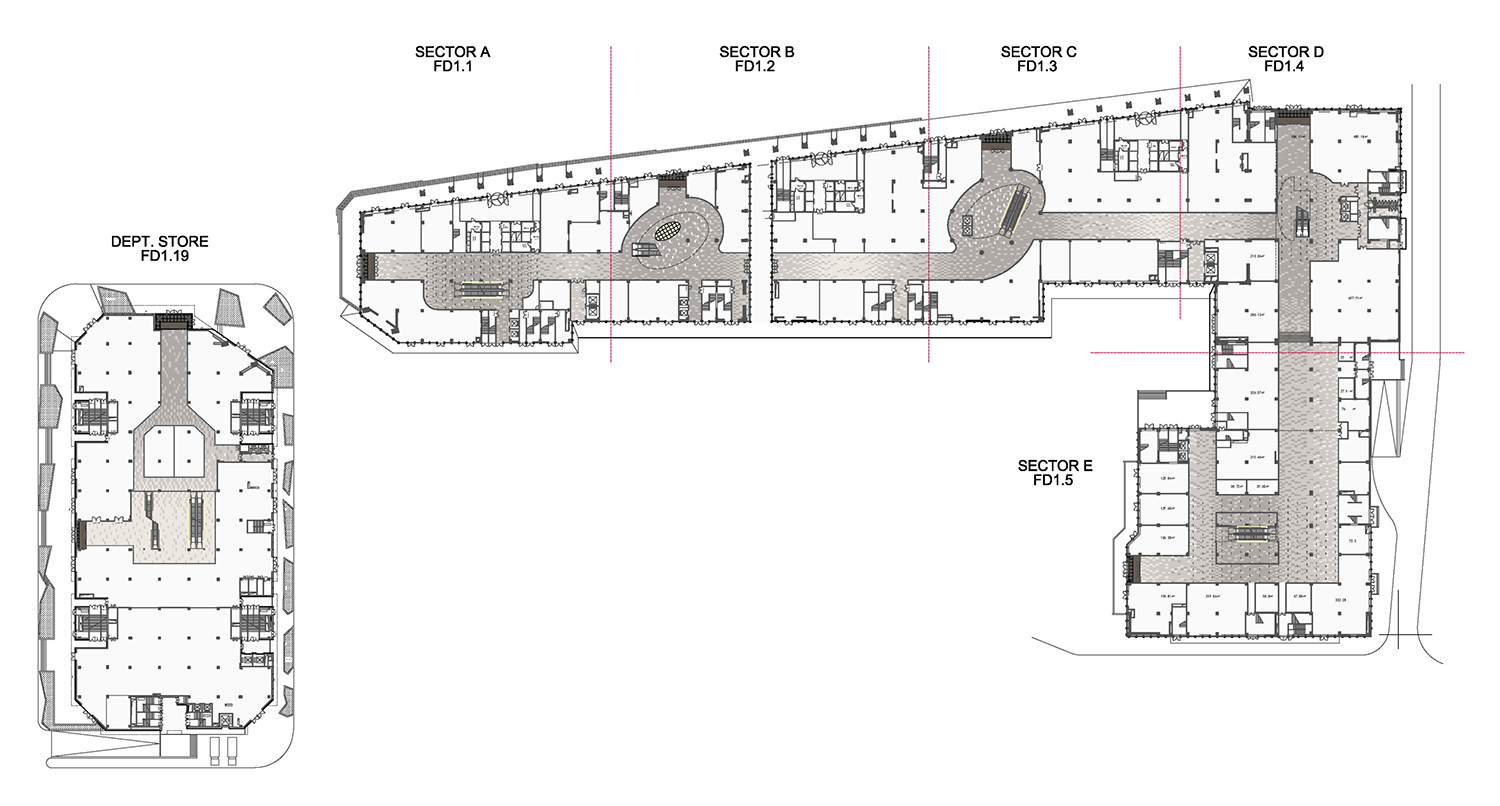 建筑外觀設(shè)計采用幾何分割的陣列效果突顯商務(wù)風(fēng)。室內(nèi)空間則同樣延續(xù)建筑的設(shè)計元素,采用規(guī)律性的幾何圖案呼應(yīng)整個建筑的設(shè)計語言。空間內(nèi)部動線的合理設(shè)計決定了購物環(huán)境的便捷及消費者的線路指引,中庭則使用律動性較強的弧線作為交通樞紐的動線引導(dǎo),使設(shè)計在視覺及心理影響都發(fā)揮到最極致的作用。同時結(jié)合燈光設(shè)計的裝飾效果也為空間增添一抹活躍的購物氛圍。