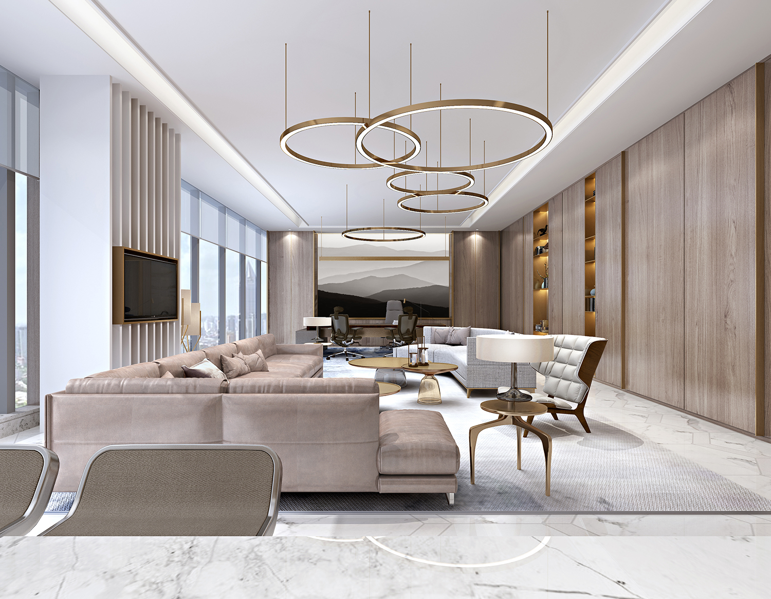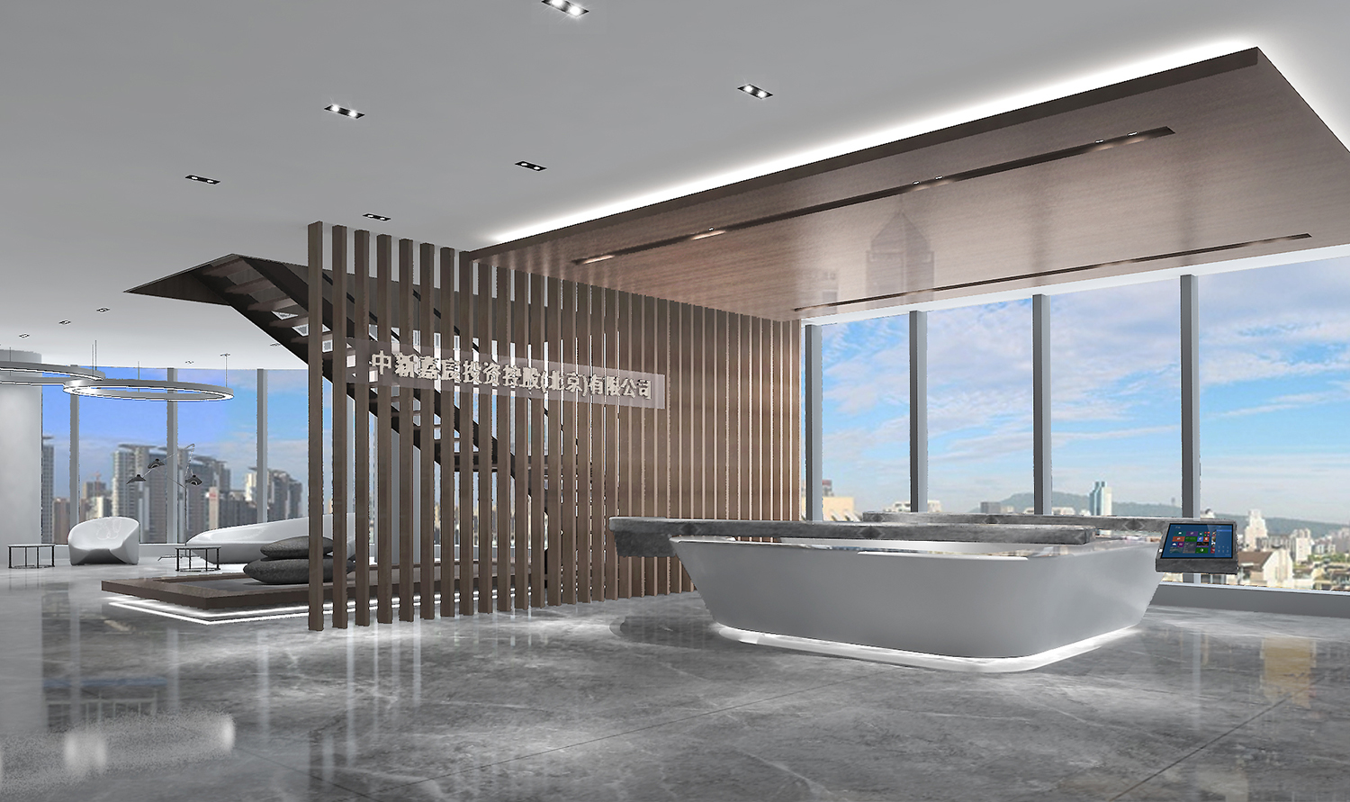 項目是某金融投資公司總部,該公司不僅是一家金融公司,還是一個以高科技、互聯(lián)網(wǎng)為主營板塊的多元化集團。因此,室內(nèi)設計不僅保持傳統(tǒng)金融公司沉穩(wěn)、大氣、豪華的特點,還加入了現(xiàn)代、時尚、科技的設計元素。傳統(tǒng)與創(chuàng)新恰到好處的融合在一個空間之內(nèi)。