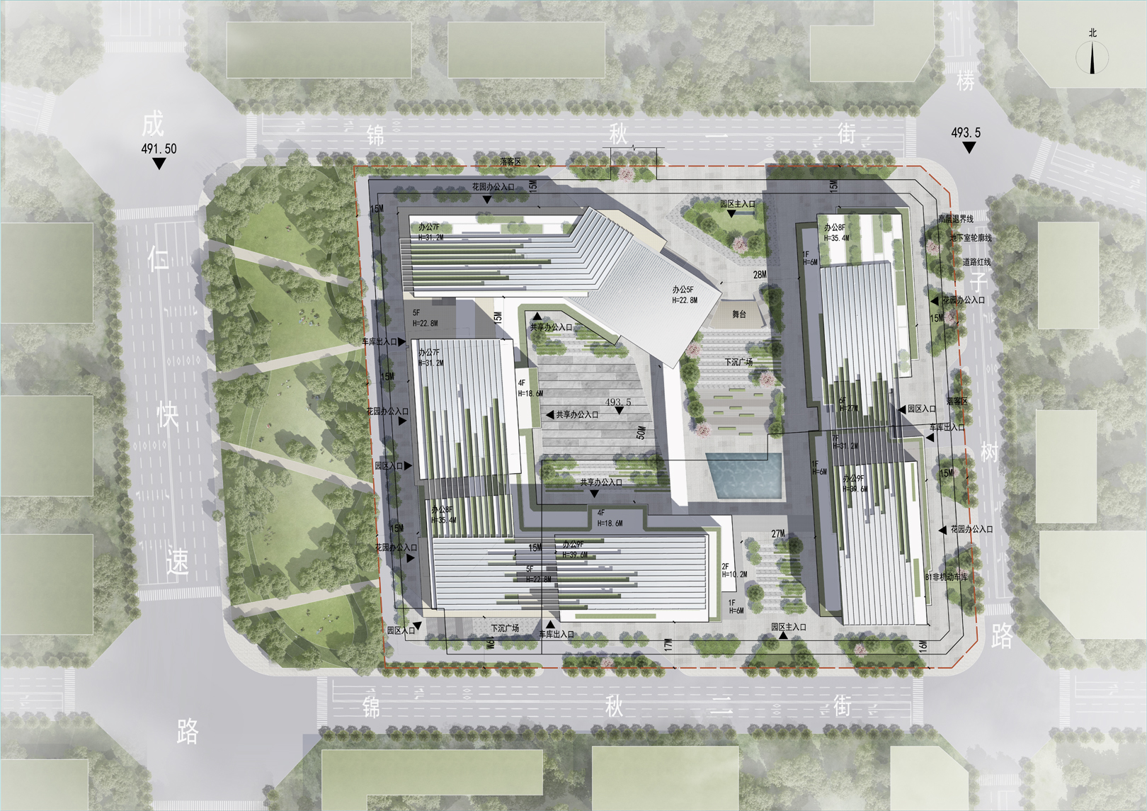 項(xiàng)目距成都市中心僅10分鐘車程,雙流國(guó)際機(jī)場(chǎng)20分鐘車程,6分鐘可到達(dá)成都東站。項(xiàng)目充分挖掘土地價(jià)值,通過城市界面與景觀資源的軸線對(duì)接與滲透,實(shí)現(xiàn)資源最佳匹配,保證園區(qū)創(chuàng)新性、互動(dòng)性、生態(tài)性的最大化體現(xiàn)。立體層面劃分不同性質(zhì)功能使用,引入多層次垂直綠化體系,通過不同功能使用性質(zhì)的豎向分區(qū),打造互動(dòng)融合、活力高效的產(chǎn)業(yè)空間。