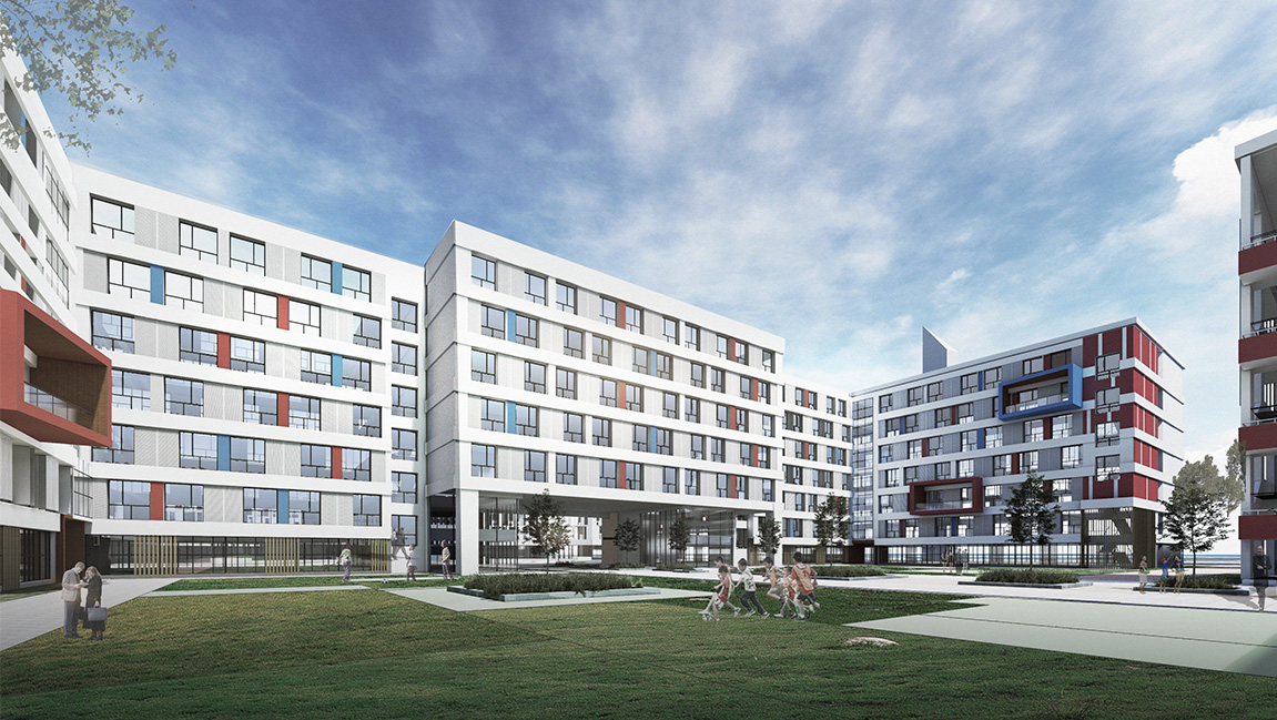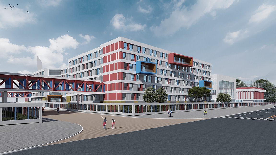 項目用地被一條市政道路分隔為東西兩個部分。依據(jù)青少年身心發(fā)展階段及年齡認(rèn)同感的考量,將初、高中并置于東側(cè)面積較小的地塊,生活區(qū)則置于西側(cè)較大的地塊,生活區(qū)主要包含宿舍樓、食堂和一座劇場 ;此外還包含一塊獨(dú)立劃分的小學(xué)。兩個區(qū)塊出入口均朝向規(guī)劃中的次要道路以規(guī)避城市快速路的不利影響,繼而將各教學(xué)單元依據(jù)自身所需的采體育+教育: 拜仁足球?qū)W校,太原,中國Sports+Education: Bayern Football International School, Taiyuan, China光、通風(fēng)等物理條件進(jìn)行合理高效的系統(tǒng)化布局。