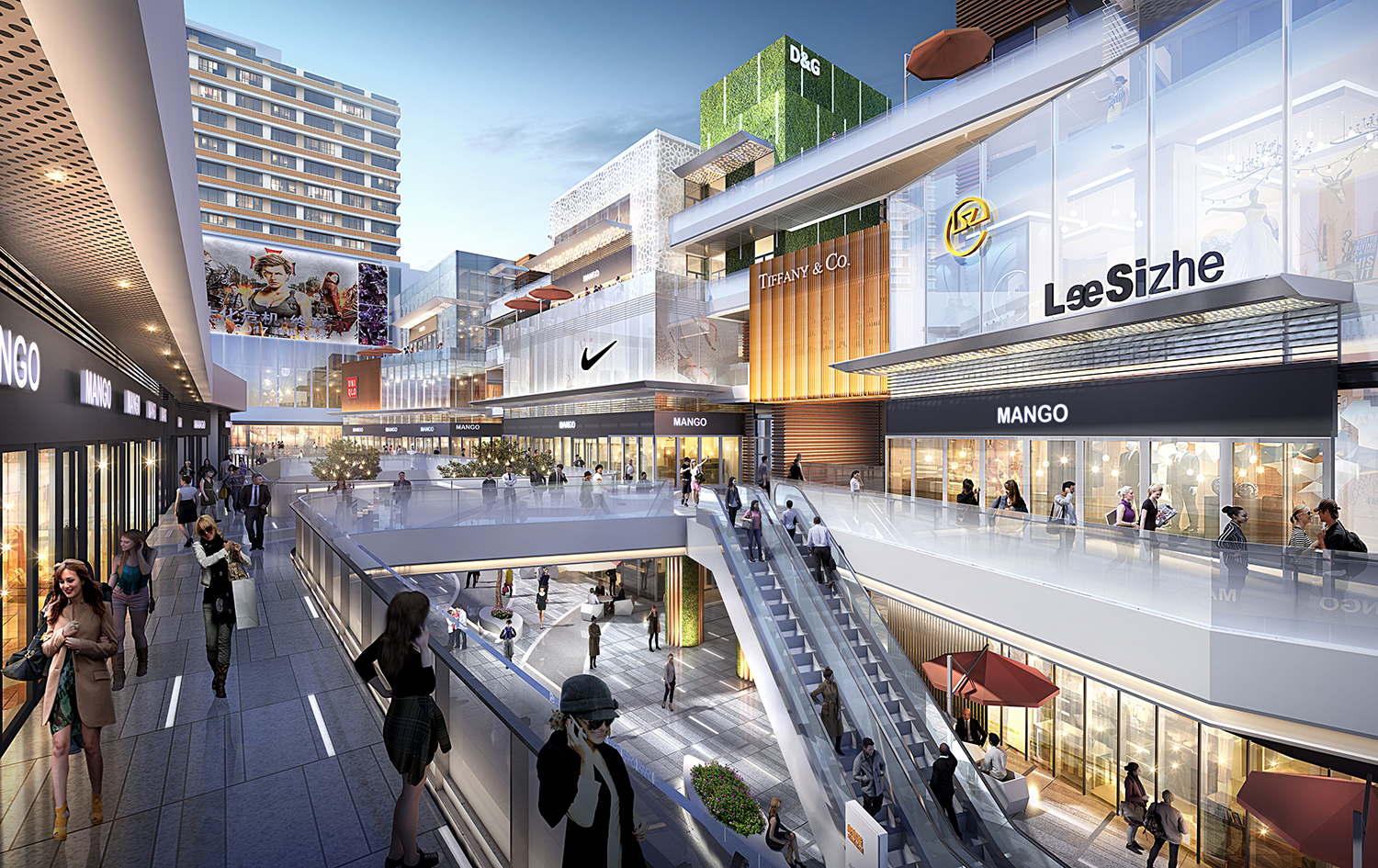項(xiàng)目建筑主體功能主要由多層商業(yè)、精品酒店式公寓和普通公寓組成。北側(cè)為快速道新都大道,西側(cè)隔地為主干道興樂北路,南側(cè)為社區(qū)級(jí)道路規(guī)劃交錯(cuò)縱橫的綠網(wǎng),與城市綠帶及水系串聯(lián),基地側(cè)緊鄰新都大道及興樂路綠化保護(hù)帶,南側(cè)為規(guī)劃河道黃家河,景觀條件良好。項(xiàng)目規(guī)劃引入兩條軸線,呈L形將街區(qū)商業(yè)貫穿,導(dǎo)入人流。L形的規(guī)劃構(gòu)架,即解決了人流導(dǎo)入的問題,也為消防和分期建設(shè)提供了便利性。高層與街區(qū)商業(yè)及綜合體裙房組合,沿主T道分設(shè)街區(qū)商業(yè)及商業(yè)廣場(chǎng),豐富了業(yè)態(tài),并與酒店無縫對(duì)接。
