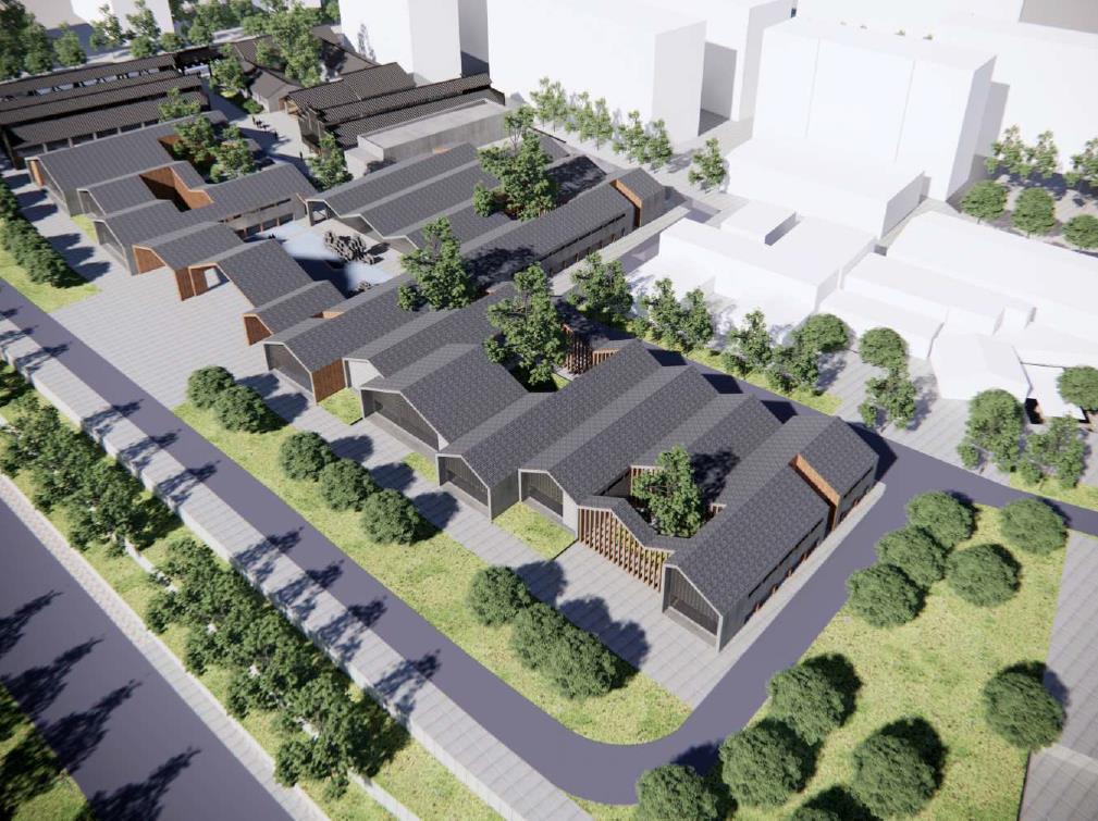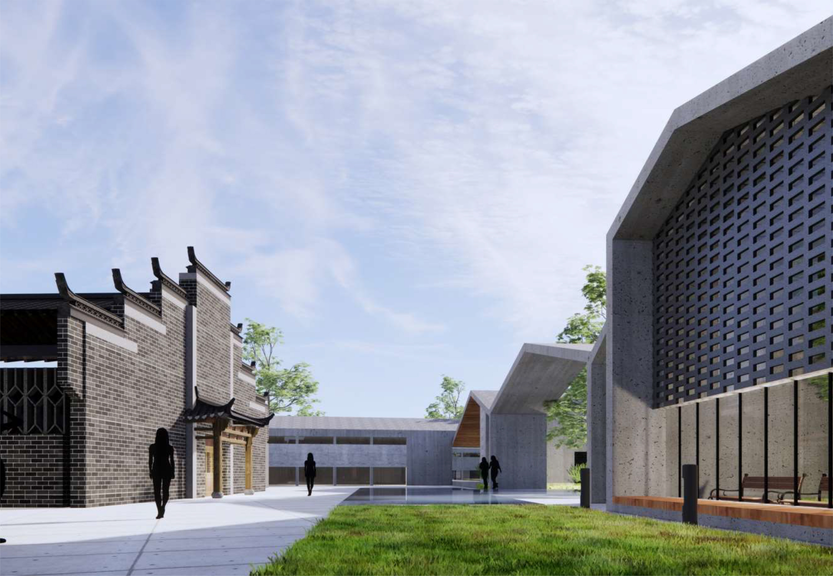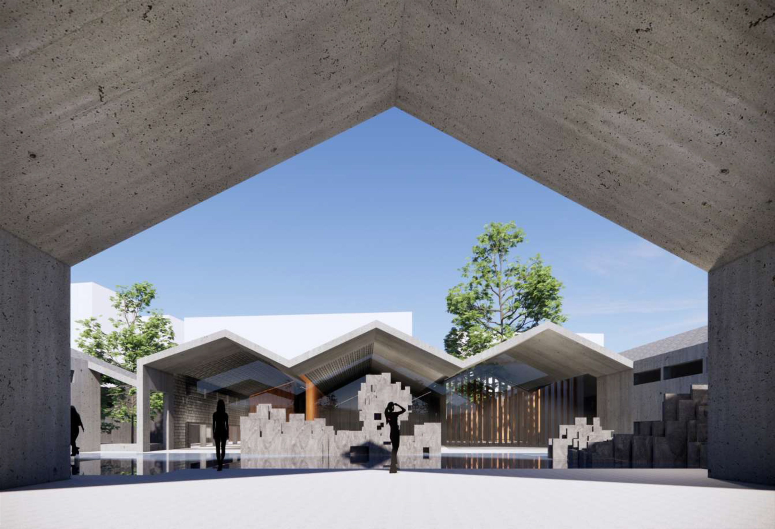 屋頂沿用老建筑的坡屋頂形式,在擴(kuò)建區(qū)域采用連綿不缺的坡屋頂,創(chuàng)造統(tǒng)一的空間形態(tài)符號打破原有山墻形態(tài),與屋頂結(jié)合采用“門”式符號化語匯,采用清水混凝土材料,營造安靜,沉穩(wěn),高雅的氛圍,山墻形態(tài)采用多種形式,以豐富低處視覺體驗(yàn),采用格柵和鏤空山墻創(chuàng)造光影陸離的靜謐環(huán)境。